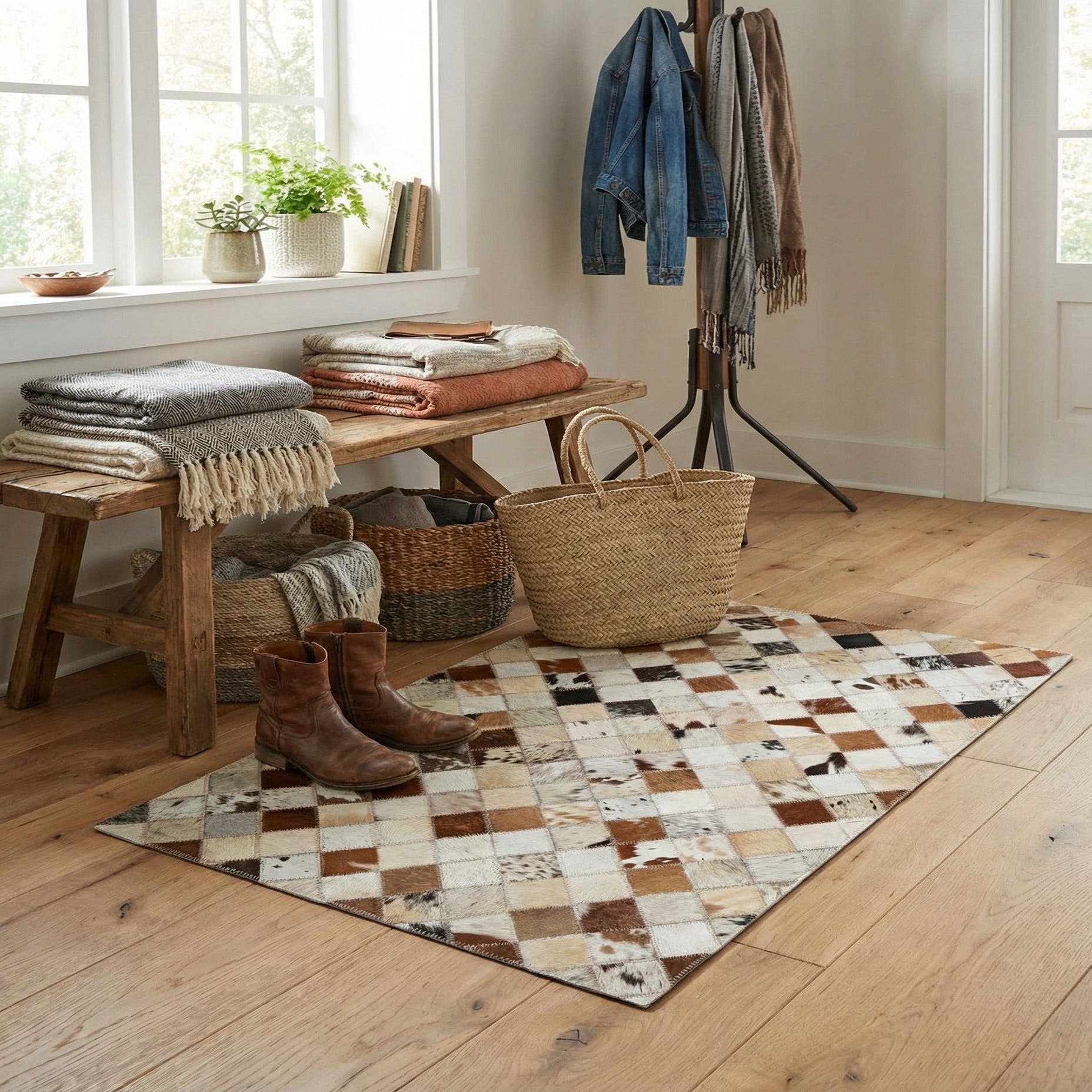 2x3 rectangular Cowhide Leather rug featuring a patchwork of multi-colored diamond-shaped cowhide pieces in various natural brown, white, and black tones.