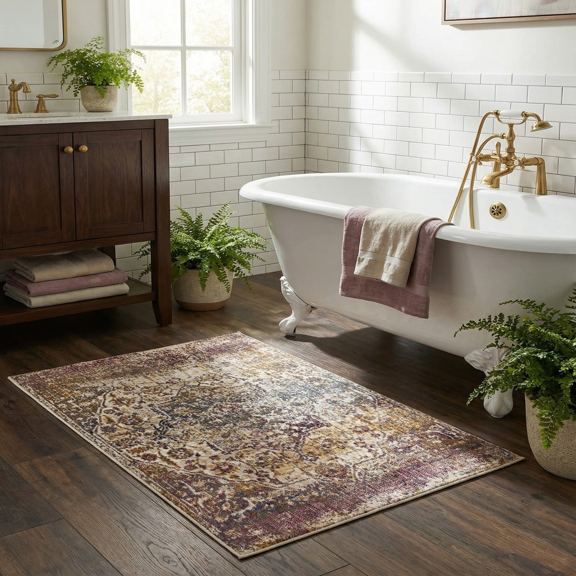 A rectangular 2x3 Deepa rug with a distressed traditional medallion pattern in multi-colored hues, including purple, gold, and gray.
