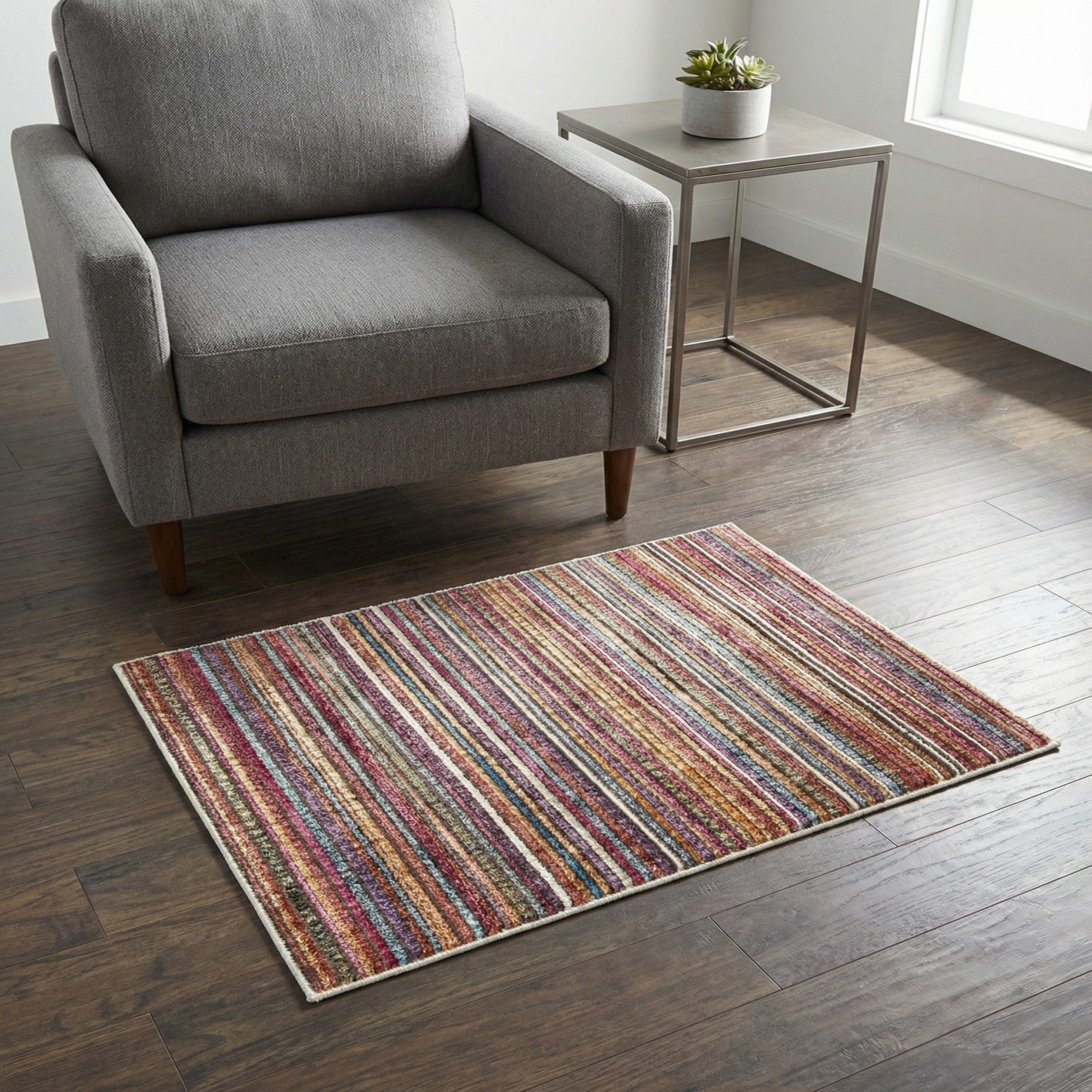 Machine made from 100% polyester, the pile has a soft, low-profile hand that feels comfortable underfoot and shows color with a gentle sheen. The tight construction produces a slightly ribbed surface where the stripes meet, so the rug has a tactile quality when you run your hand across it. Use this piece in an entryway or by a bedside to introduce color in a small space, layer it over a larger neutral rug for added pattern, or place it beneath a compact writing desk or seating nook to define the area while keeping the palette lively and balanced.
