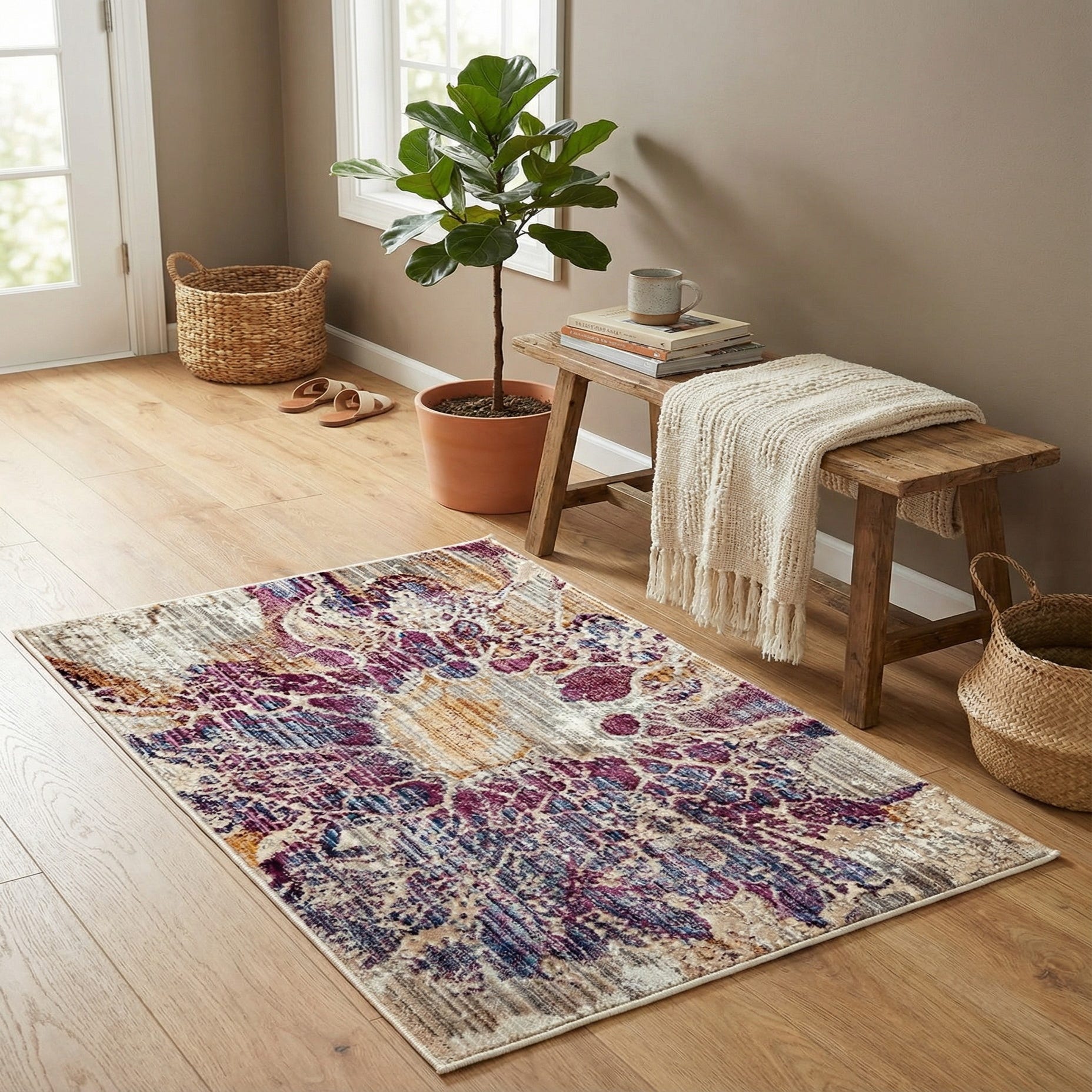 A bold, abstract floral medallion anchors this piece, its purple and light-blue petals layered over a multi-hued, striated field of ivory, gray and gold. The pattern blends organic floral shapes with a gently distressed background and vertical striations that add depth and motion. Color shifts—from warm gold accents to cool gray and light-blue highlights—create a lively, modern-traditional look that works with both contemporary and eclectic palettes.