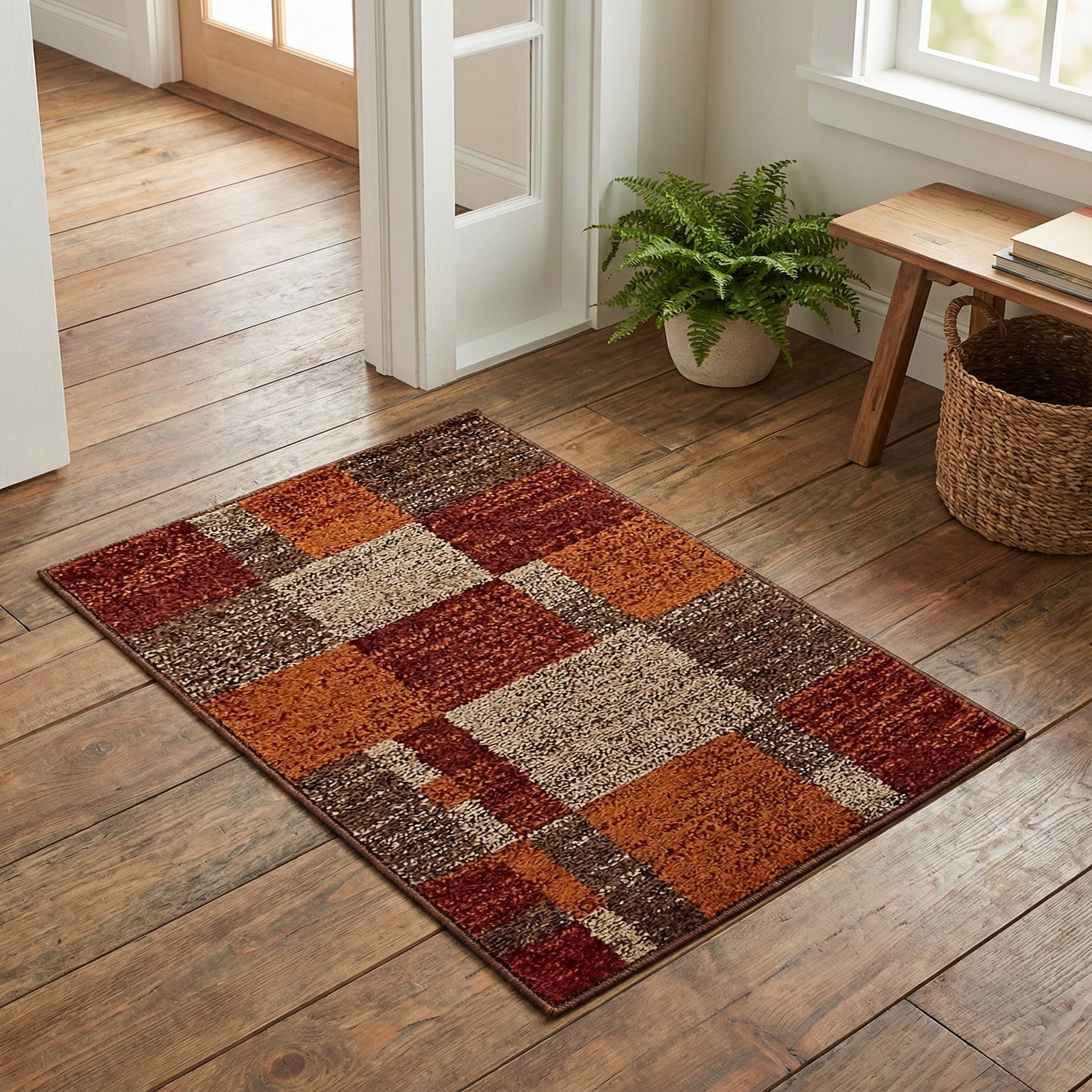 The Equinox collection presents a 2x3 area rug, machine-woven from 100% polypropylene, ensuring durability and ease of maintenance. This rug features a dynamic block pattern, showcasing a harmonious blend of neutral and warm tones including beige, brown, burgundy, and orange set against a multi-colored background. The well-defined squares create an engaging geometric aesthetic, making it a versatile addition to a variety of interiors.
