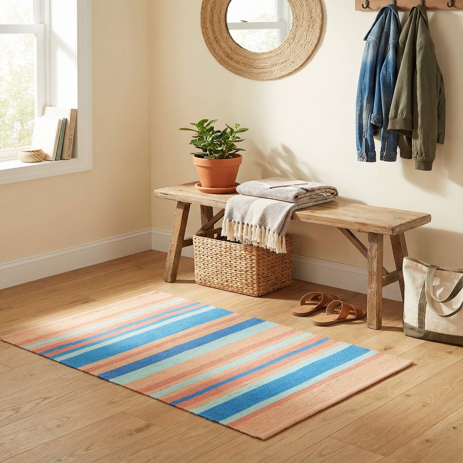 A 2x3 rectangular flatweave cotton dhurrie rug featuring horizontal stripes in varying shades of peach, coral, light blue, and royal blue.