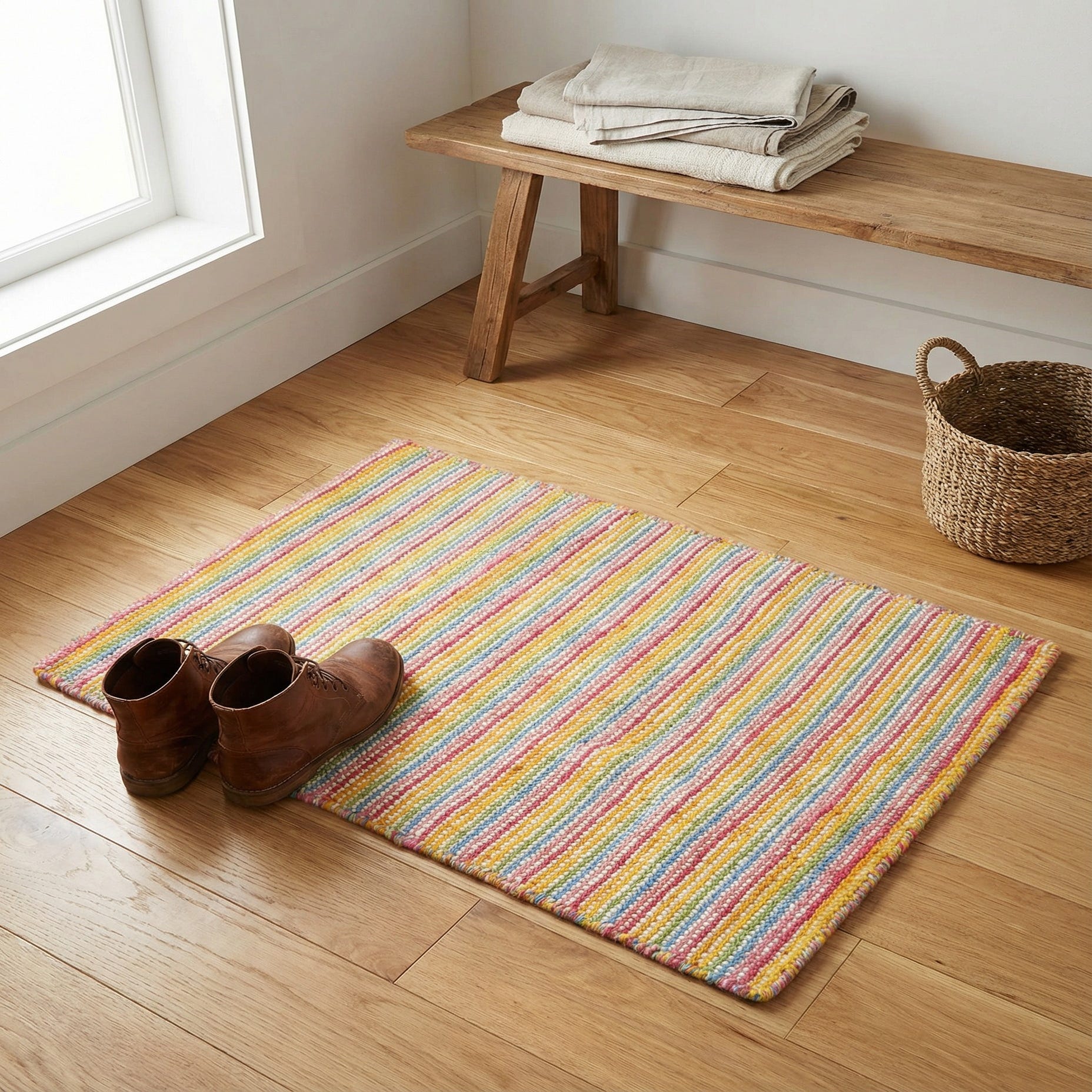 A 2x3 rectangular, multi-colored wool rug with horizontal stripes in pink, blue, yellow, and green, perfect for an entryway.
