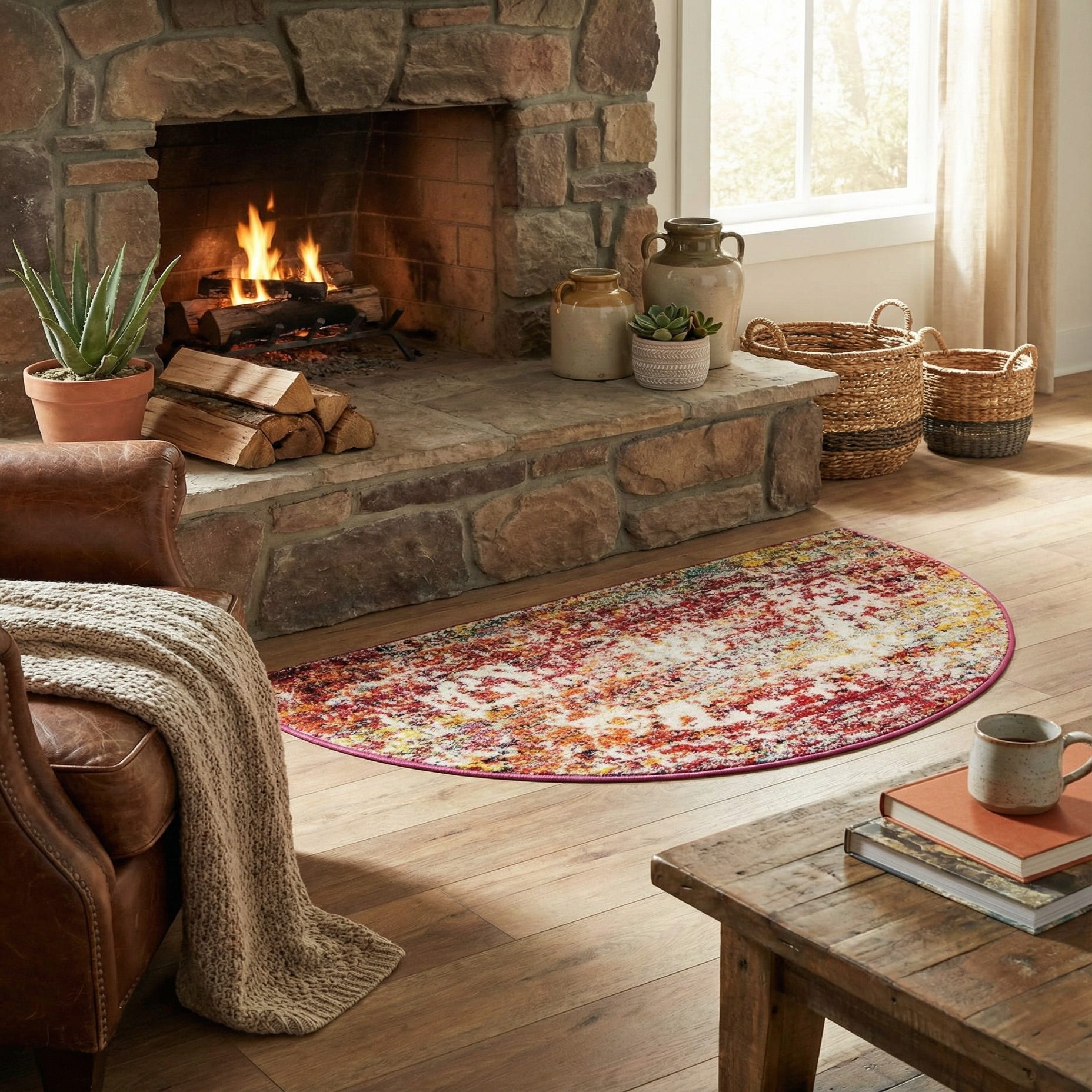 This rug works well as a small statement piece at a fireplace, the base of a small entry console, or layered in a casual seating nook. Pair it with warm woods and neutral upholstery to let the colors pop, or coordinate with jewel-toned pillows and a textured throw for a more purposeful, lively vignette. Its resilient polypropylene construction makes it a practical accent for everyday spaces that benefit from a colorful, contemporary touch.