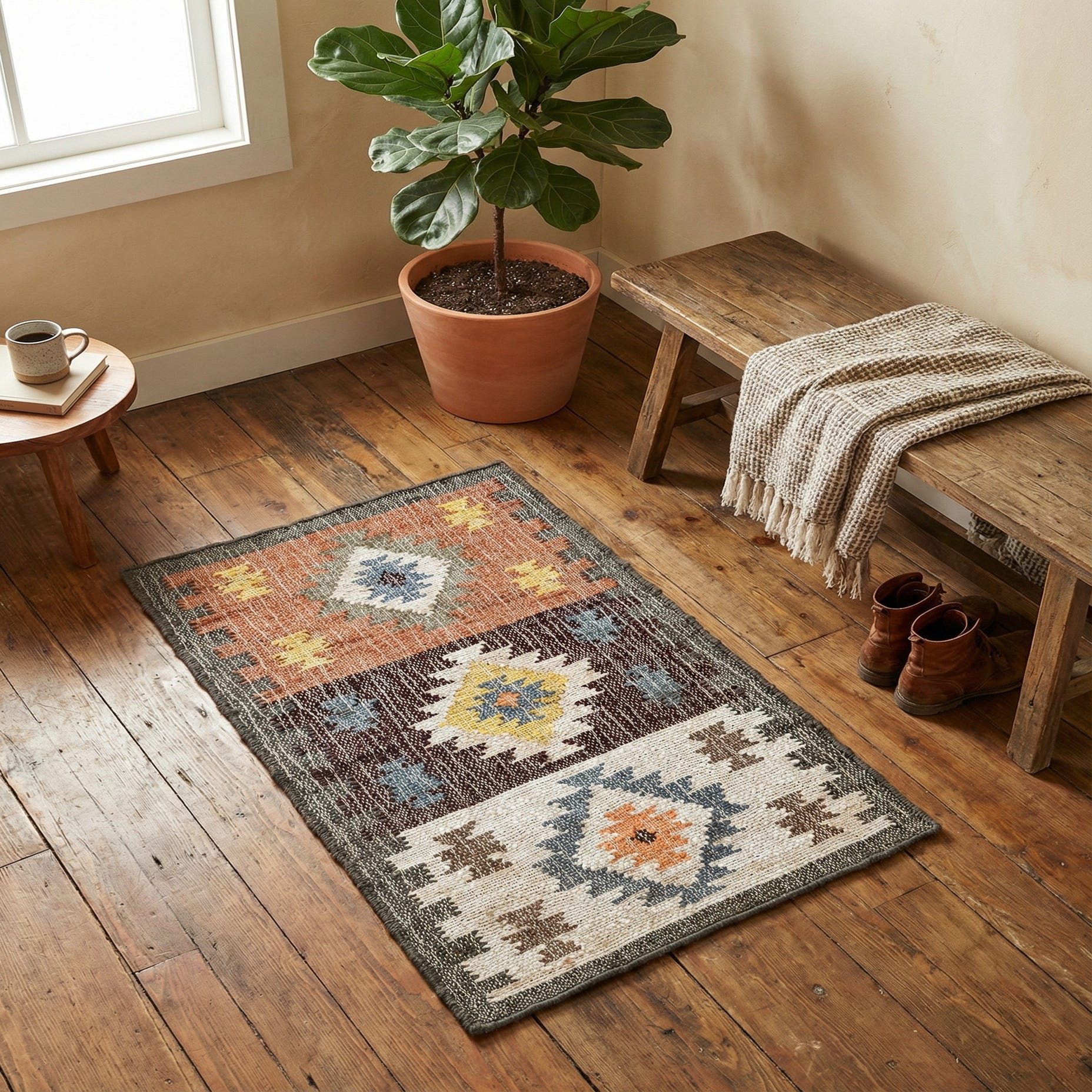 Underfoot the rug has a low?profile, flatweave feel — the jute provides an earthy, fibrous hand while the cotton softens the surface just enough for everyday use. Its scale and structure make it well suited for high-traffic narrow spaces such as entryways and hallways, as an accent in front of a kitchen sink or stove, or layered at the foot of a bed or on a reading nook to introduce pattern without bulk. The mix of warm rust and burgundy with cool light blue and yellow accents complements mid?century, bohemian, farmhouse, or eclectic interiors and works nicely with worn woods, metal finishes, and neutral upholstery.