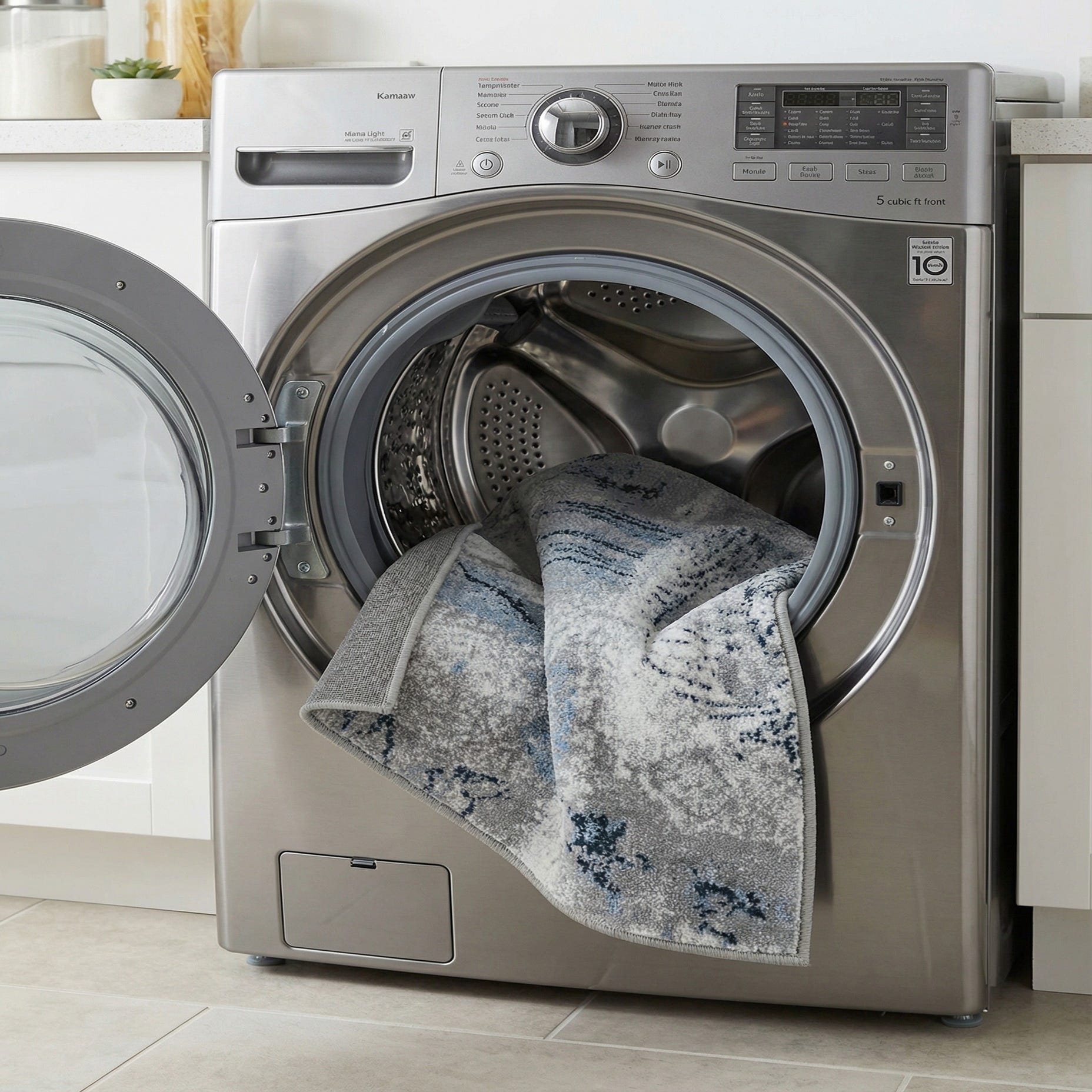 A 2x3 rectangular Kamala Washable rug featuring an abstract coastal design in shades of grey, blue, and black.