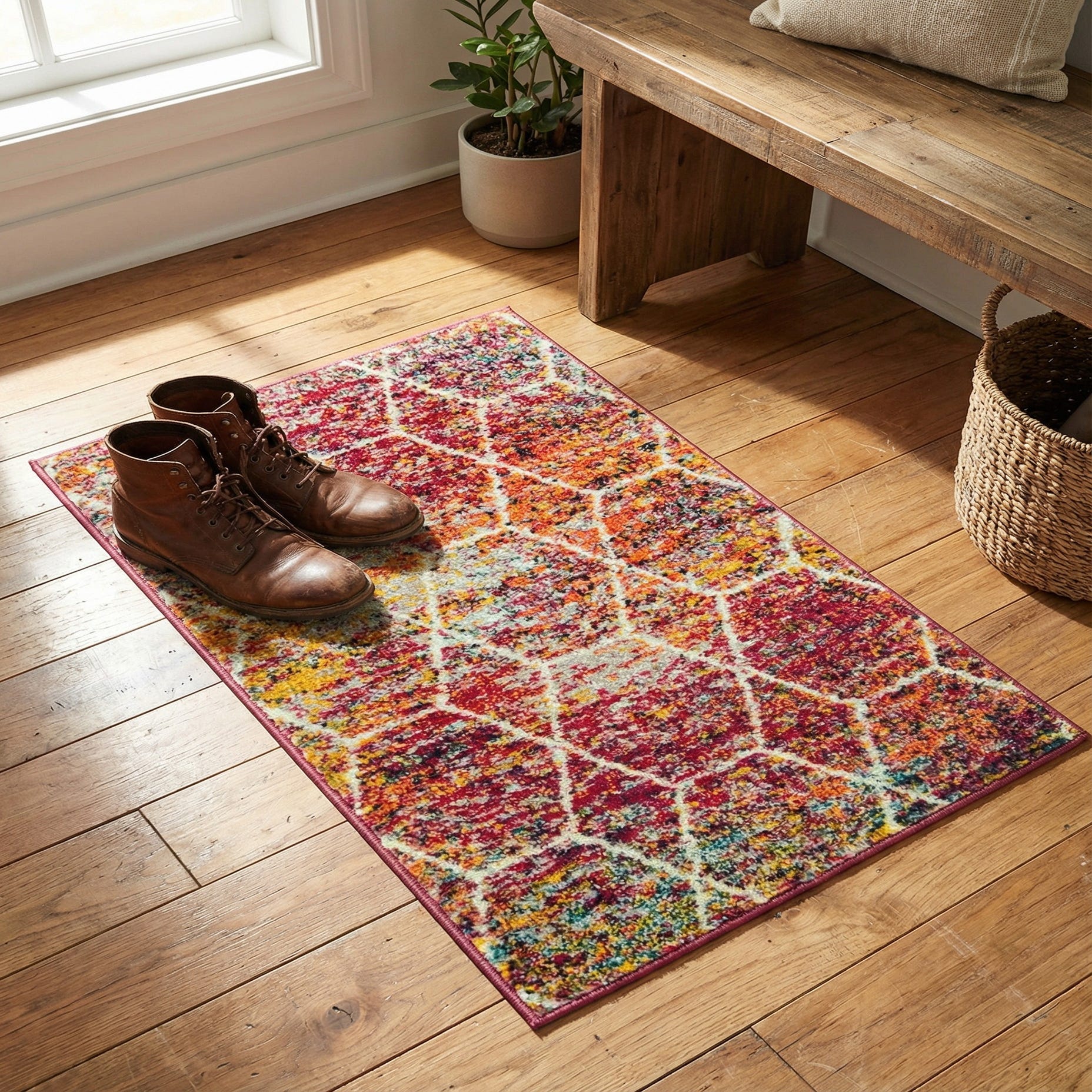 This piece works well as a colorful accent in small seating areas, an entryway, or layered over a larger neutral rug to bring energy to the room. It pairs naturally with warm wood tones and solid upholstery for balance, and also complements eclectic or bohemian schemes where mixed color and pattern are welcome. For a more modern look, use it to add a playful pop of color against minimalist furniture and pared-back accessories.