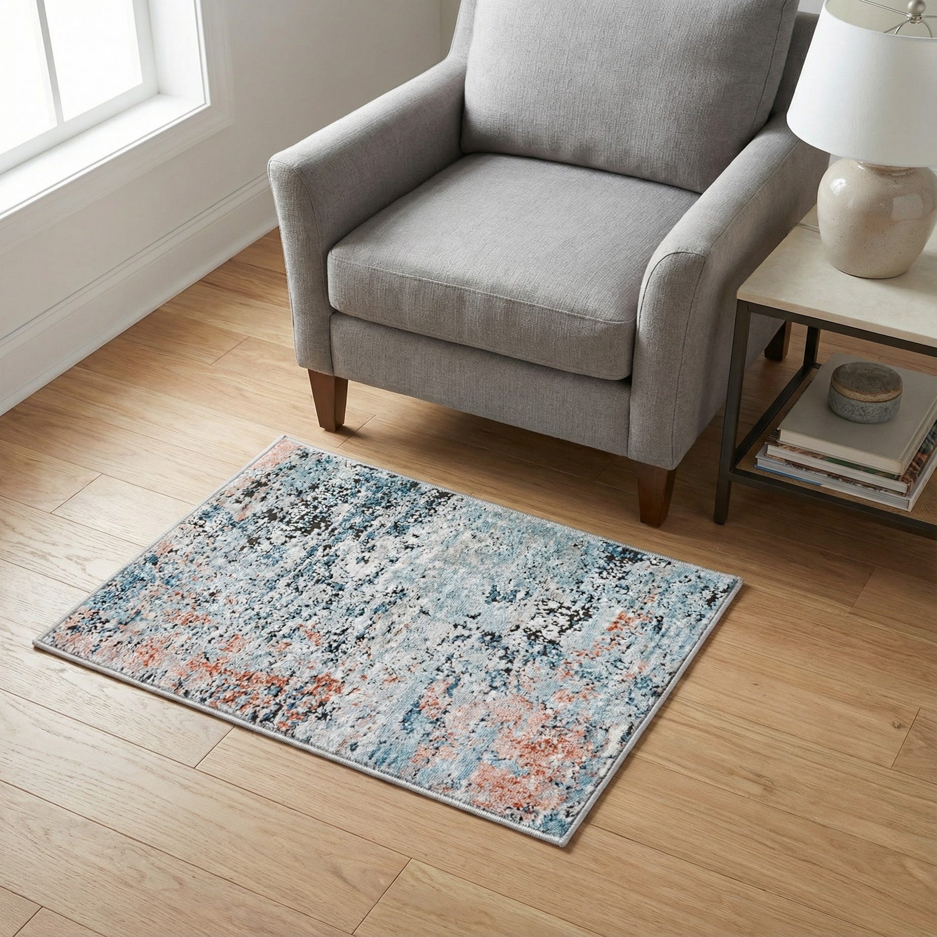 This piece works well as a small accent to define cozy corners—place it beside a bed, under a reading chair, or layered in front of a sofa to introduce color and softness. It pairs nicely with light or weathered wood tones, neutral grays and ivories, or deeper navy and charcoal furnishings; it complements modern, coastal, transitional, or relaxed bohemian interiors where a soft pop of blue and peach can unify the palette.