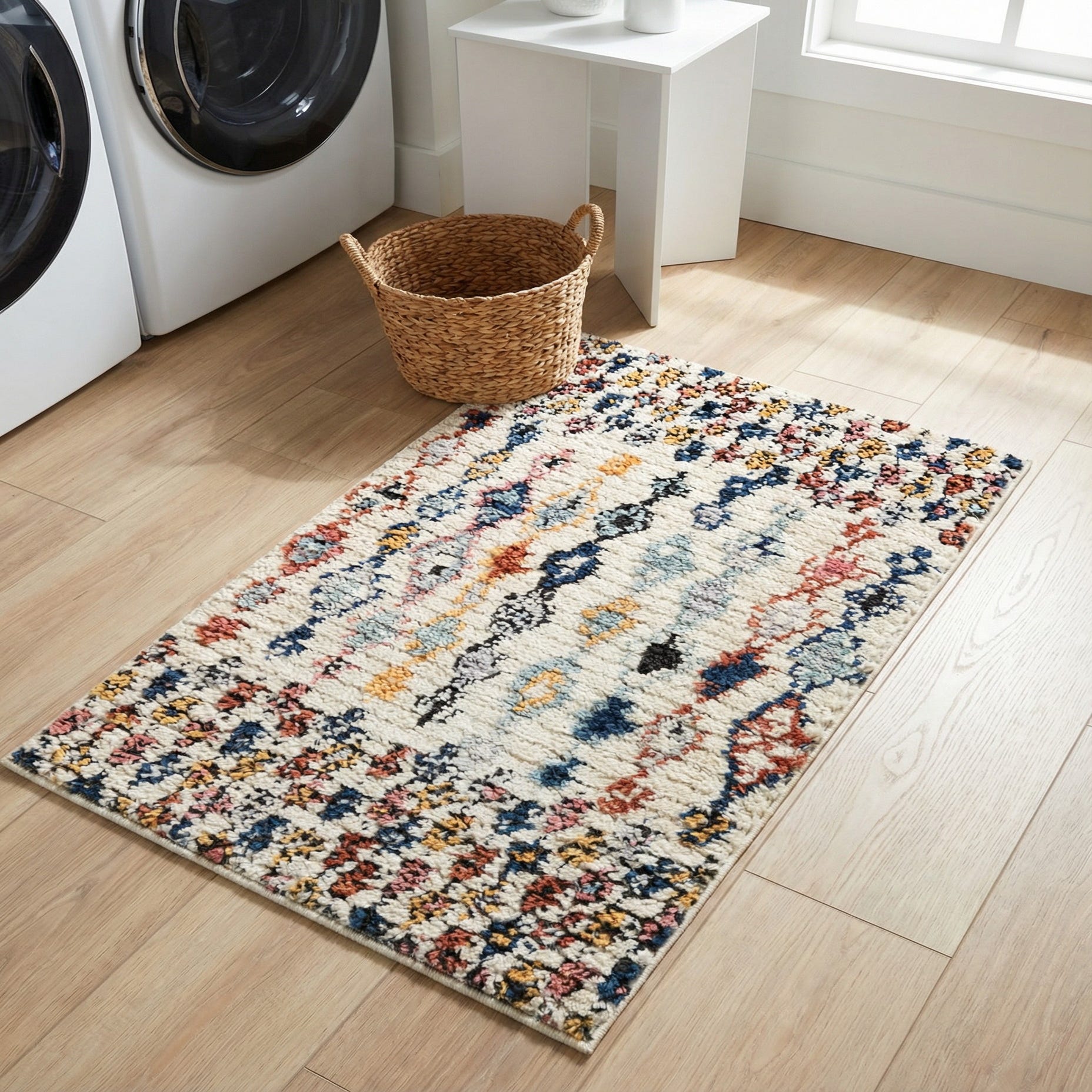 The pile is soft and plush to the touch, with a textured surface that adds warmth underfoot and visual depth beneath furniture. This rug works well in casual, bohemian or eclectic interiors and pairs nicely with warm wood tones, matte black accents or light, neutral upholstery. Use it to add color and pattern to an entryway, a cozy reading nook, beside a bed, or layered in a living area to introduce pattern without committing to a larger piece.