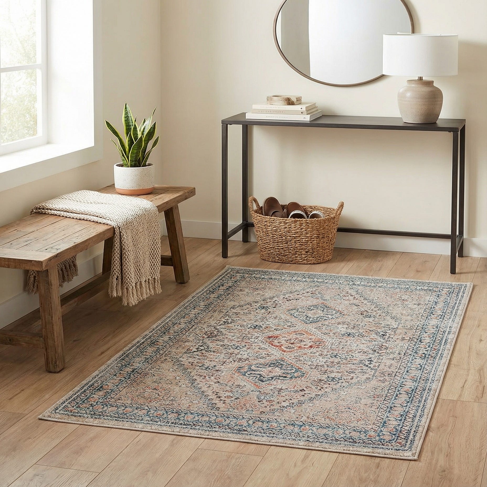 Machine made of 100% polypropylene, the rug has a smooth, slightly dense weave that feels pleasant underfoot and holds its pattern well. Place it in an entryway or in front of a sofa to introduce color without overwhelming a small space, layer it over a larger neutral rug for texture, or use it beside a bed or under a console for a cozy accent. It pairs naturally with coastal blues and sandy neutrals, transitional furnishings in warm woods, or eclectic rooms that mix vintage finds with modern pieces.