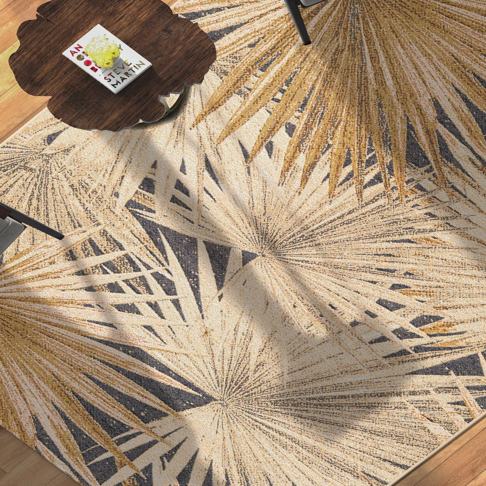 A lively botanical pattern of overlapping palm fronds gives this rug dynamic movement and natural texture. The multi background supports a warm palette of beige, brown, gold and orange with contrasting black and ivory accents, creating depth without heavy contrast. Machine made from 75% polypropylene and 25% polyester, the surface is tightly woven with a low, slightly textured pile that feels firm underfoot and highlights the woven detail of the leaf motifs.