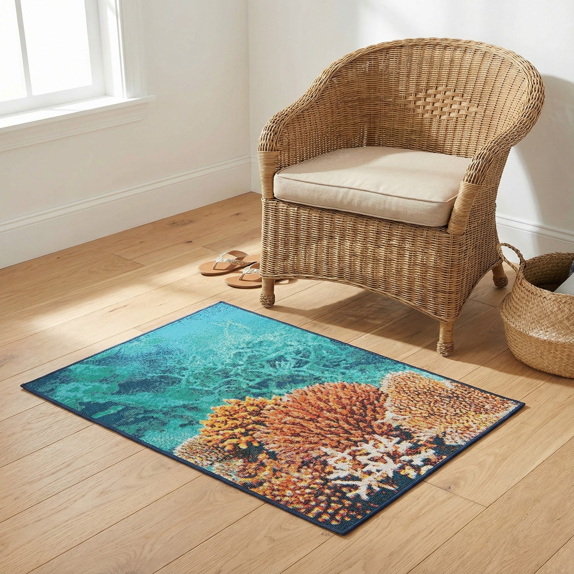 Bold coral formations and painterly ocean textures create a coastal scene that brings color and movement to outdoor and transitional spaces. Large, organic coral shapes in orange and red sit against a multi background of turquoise, blue and navy blue, with ivory and brown accents that add depth and contrast. The design balances figurative coral detail with an abstract, water-like field so it reads as both pattern and landscape. Machine made of 100% polypropylene, the rug has a tight, low-profile weave that feels smooth underfoot with a subtle textured grain from the construction.