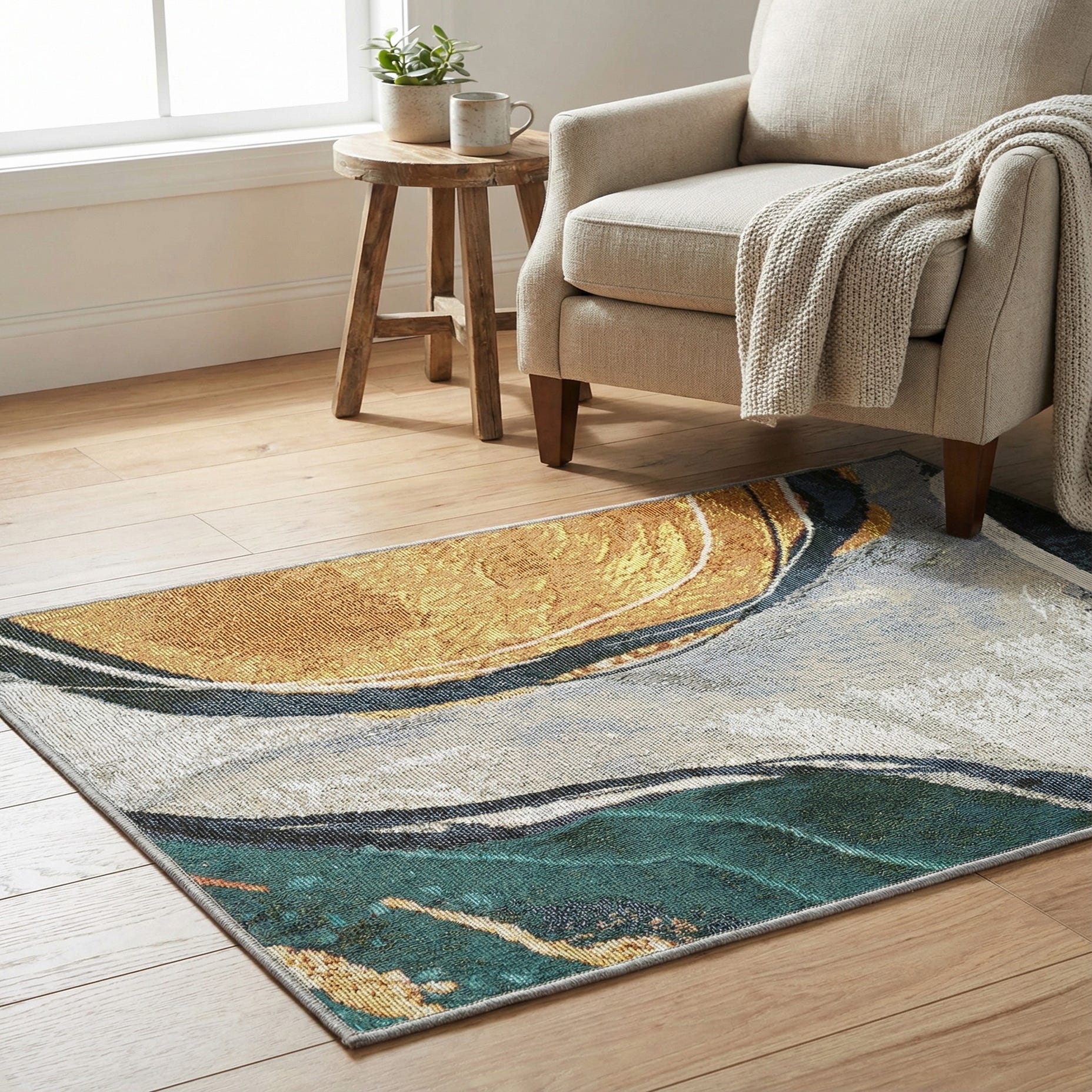 A bold, abstract composition of sweeping arcs and layered washes of color gives this rug a painterly, contemporary look. A warm yellow-gold orb sits against deep teal and navy accents, while bands of black and gray provide contrast and definition across a multi background. Areas of ivory and soft gray create a sense of movement and space within the pattern. Woven from 100% polypropylene, the surface has a low-profile, tightly woven texture that feels firm and slightly ribbed underfoot, with a smooth face that highlights the color transitions.
