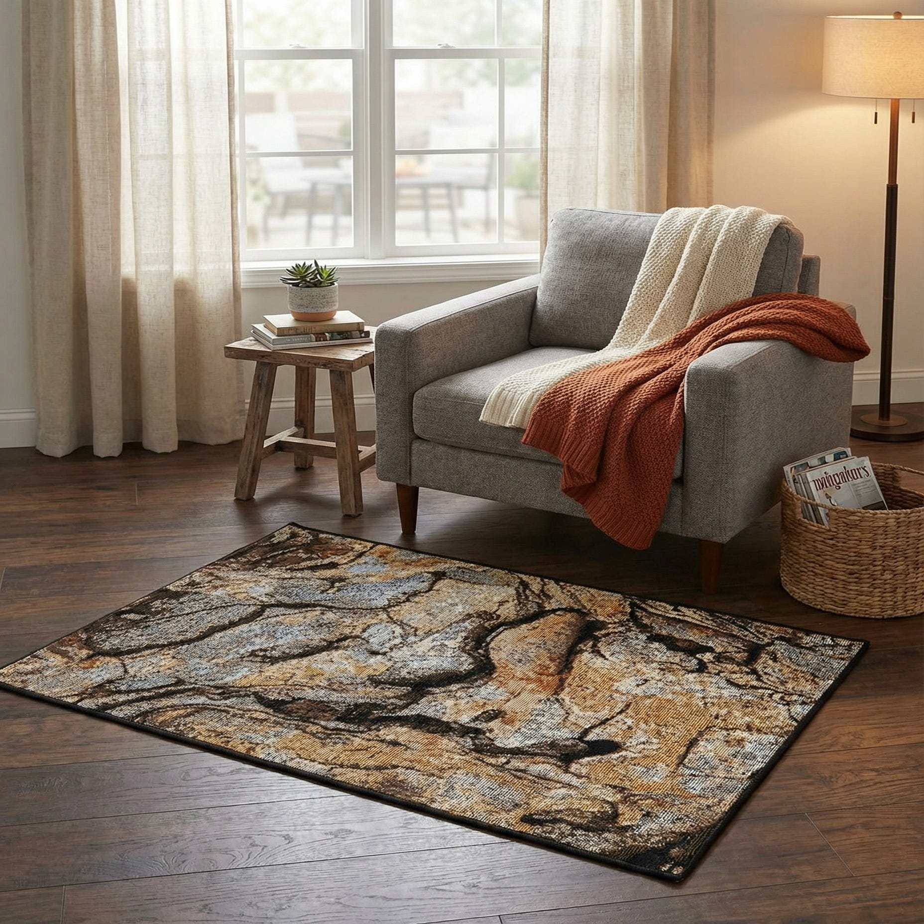 A painterly, marble-inspired pattern flows across a multi background in warm, grounded tones. Swirling veins of black and brown wind through fields of gold, beige, and light brown, while touches of gray and ivory add dimension. The design reads layered and organic, with a low-pile, tightly woven surface that has a subtle looped texture you can feel underfoot. Machine made of 100% polypropylene, the rug has a firm, structured hand that suits both indoor and outdoor settings.