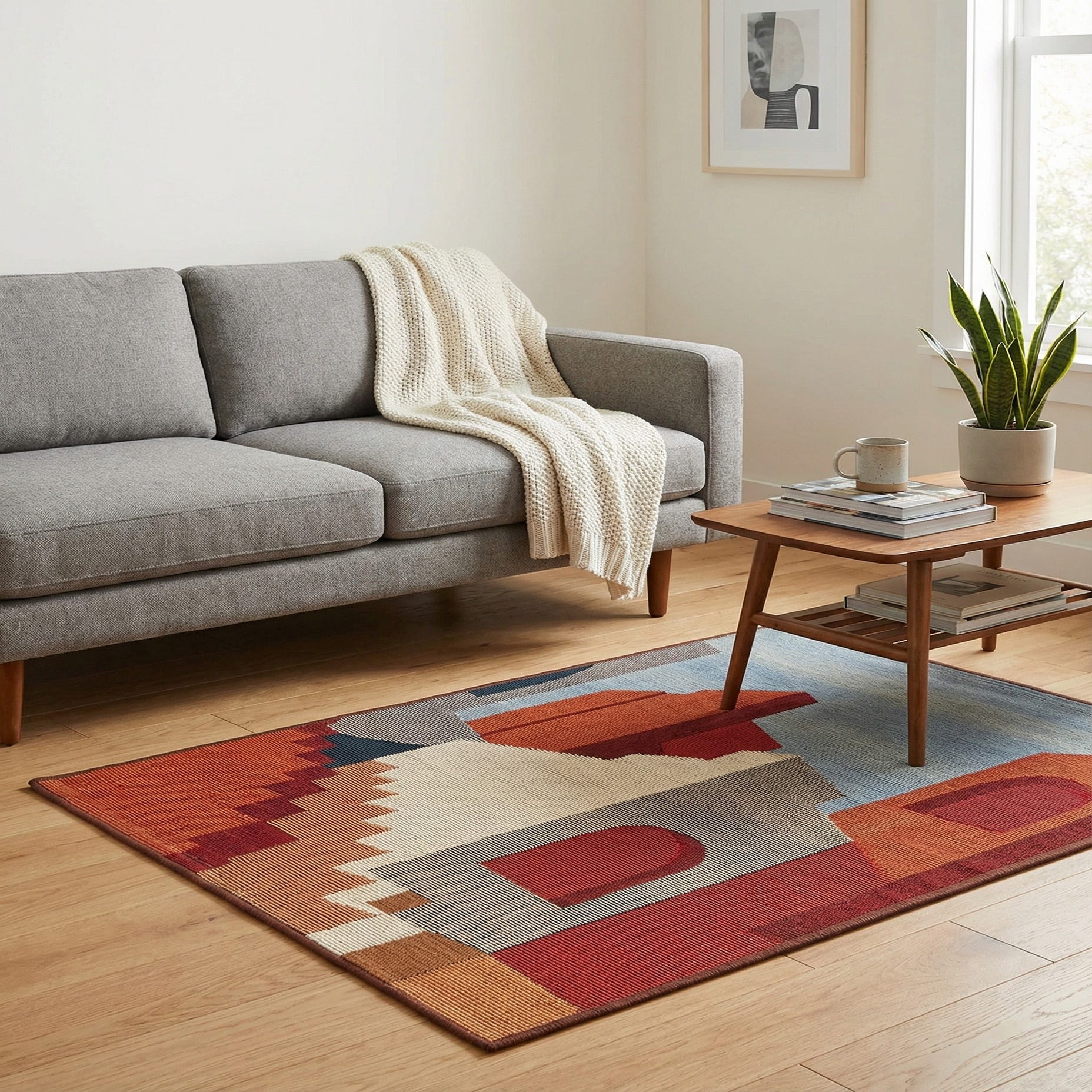 A 2x3 rectangular rug featuring a multi-colored Southwestern modern abstract design with terracotta, cream, and blue architectural shapes under a light blue sky.