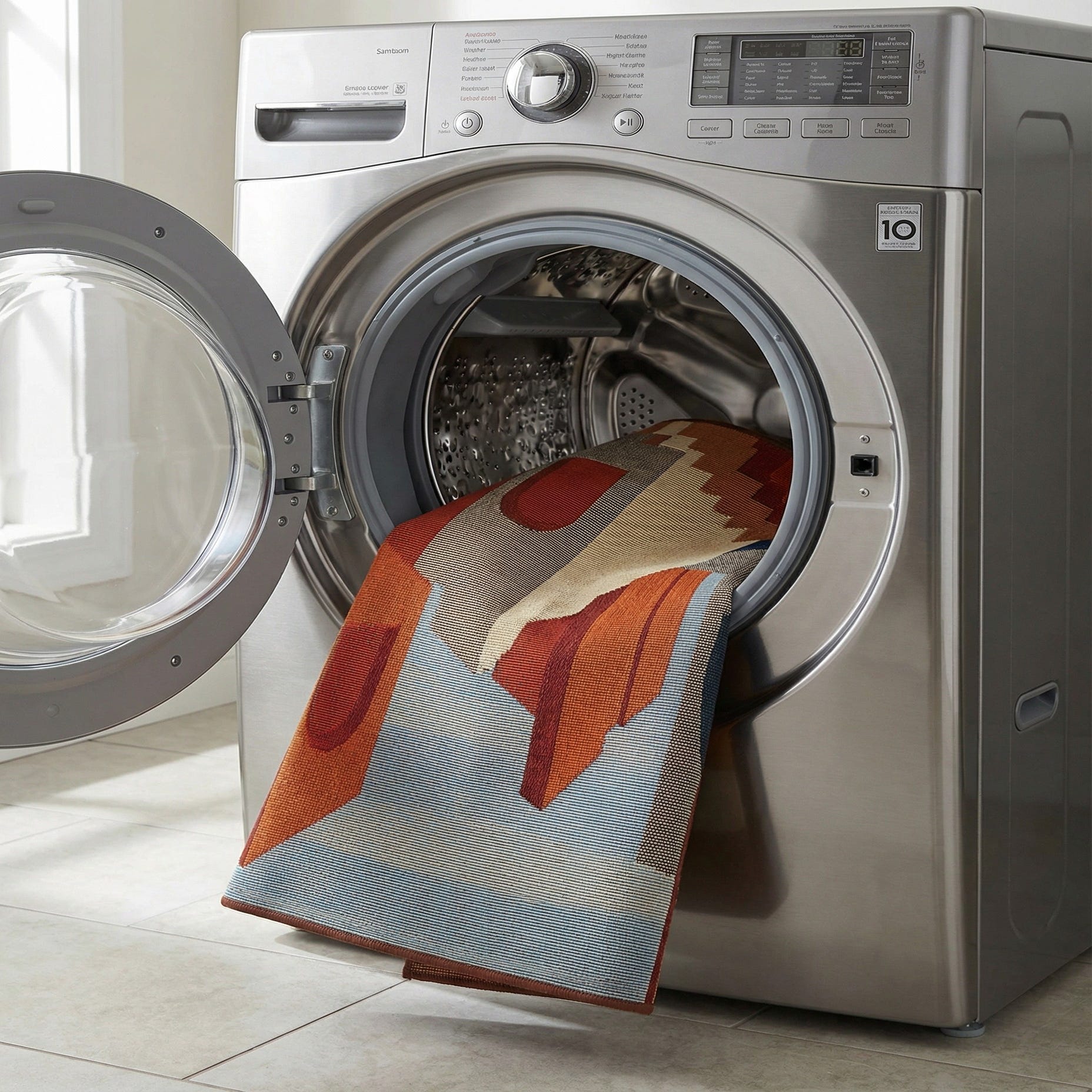 This piece works well on a covered patio or balcony as a bold outdoor accent, and it also fits cleanly into modern indoor settings — think a compact entry, a kitchen breakfast nook, or a small conversation area in a living room. Pair it with warm wood furniture, matte black metal elements, leather or woven textiles, and terracotta planters to echo the rug’s tones, or layer it over a larger neutral floor covering to define a focused design vignette.