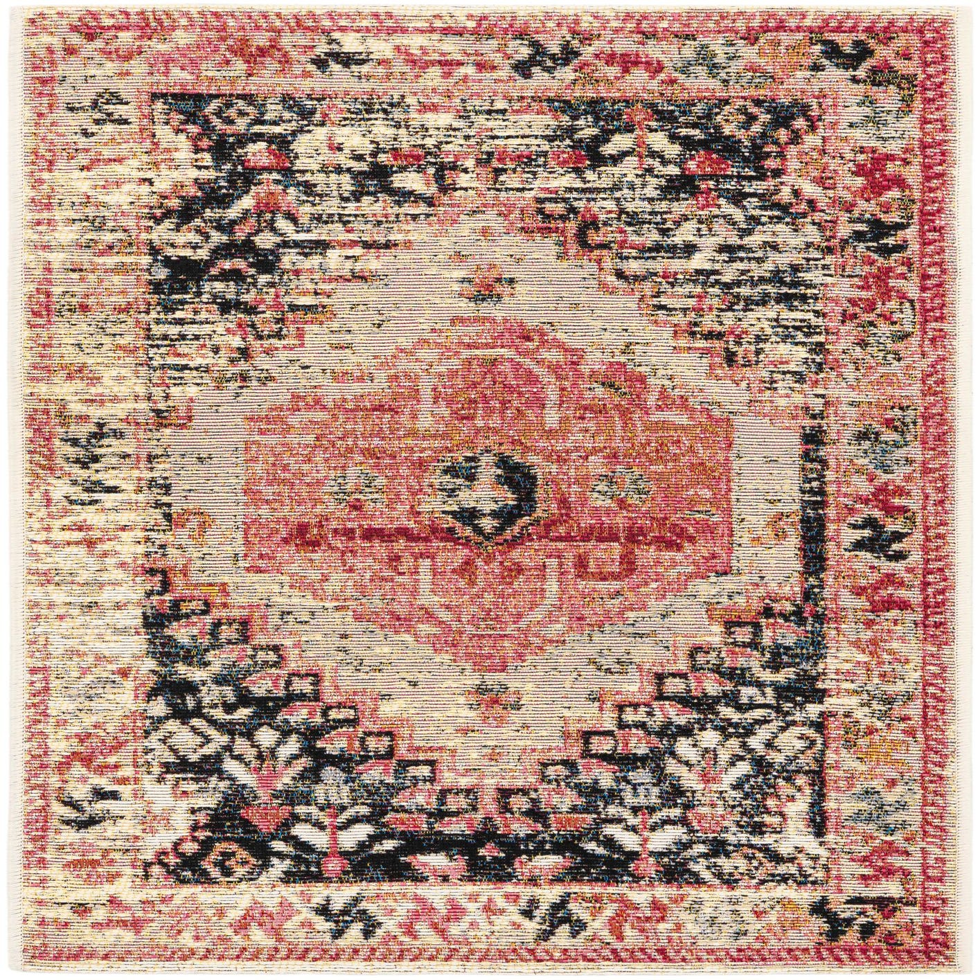 A 2x3 multi-colored rectangular rug with a distressed traditional medallion pattern in shades of red, black, and cream.
