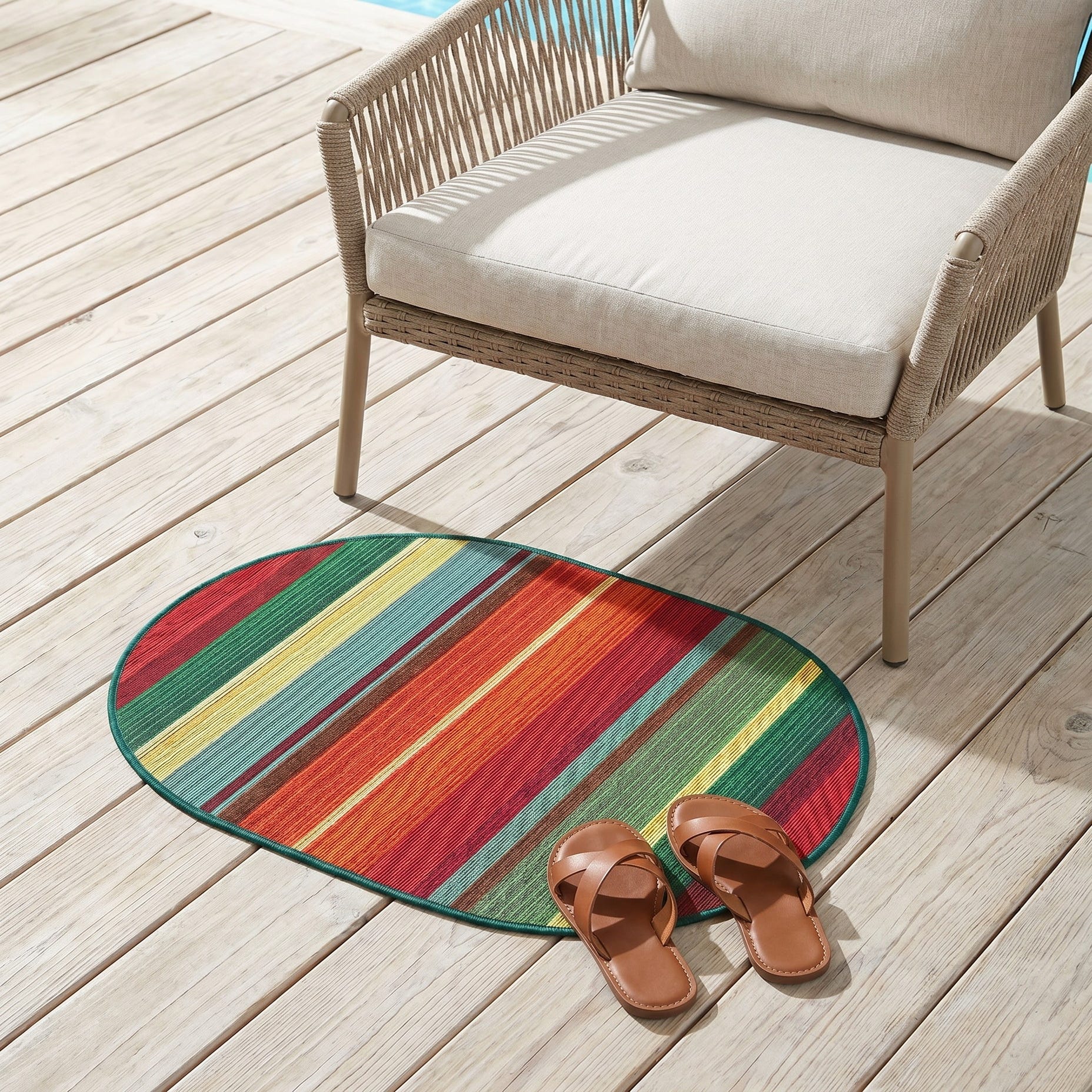 Fell in love with this rug when I saw it on-line for its delightful pattern and vivid colors. It arrived in two days from the day ordered about a week ago. We put it down on our renovated deck today...it is even more awesome than we thought it would be! The colors and pattern outset the colors of the deck perfectly.
