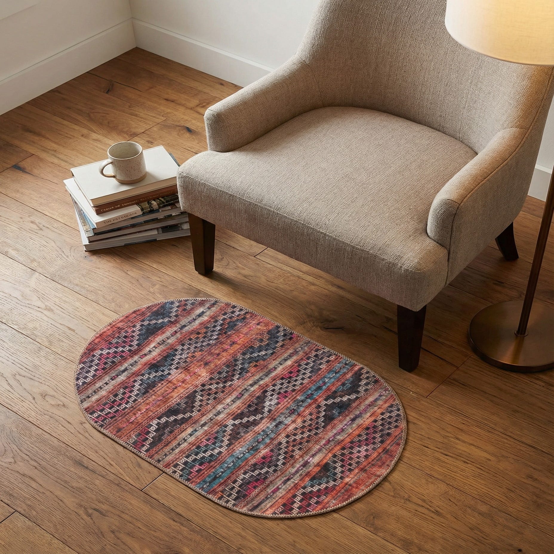 Place this piece where a compact, eye-catching layer is needed: tucked at the foot of a bed, centered beneath a small bistro table, or used to define an entry or reading nook. Its low pile and rich, varied colors work well with mid-century and bohemian schemes, and it can also add a lived-in contrast to modern neutral interiors or warm up a rustic farmhouse setting.