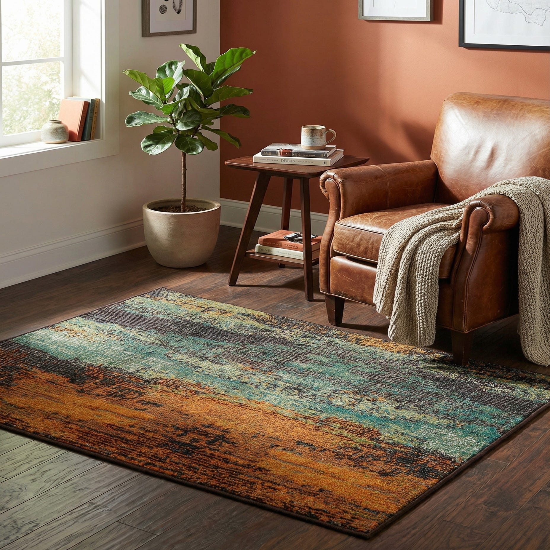 A 2x3 rectangular Rugs.com Sevilla rug featuring a modern abstract pattern with vertical stripes of vibrant orange, teal, and dark brown.