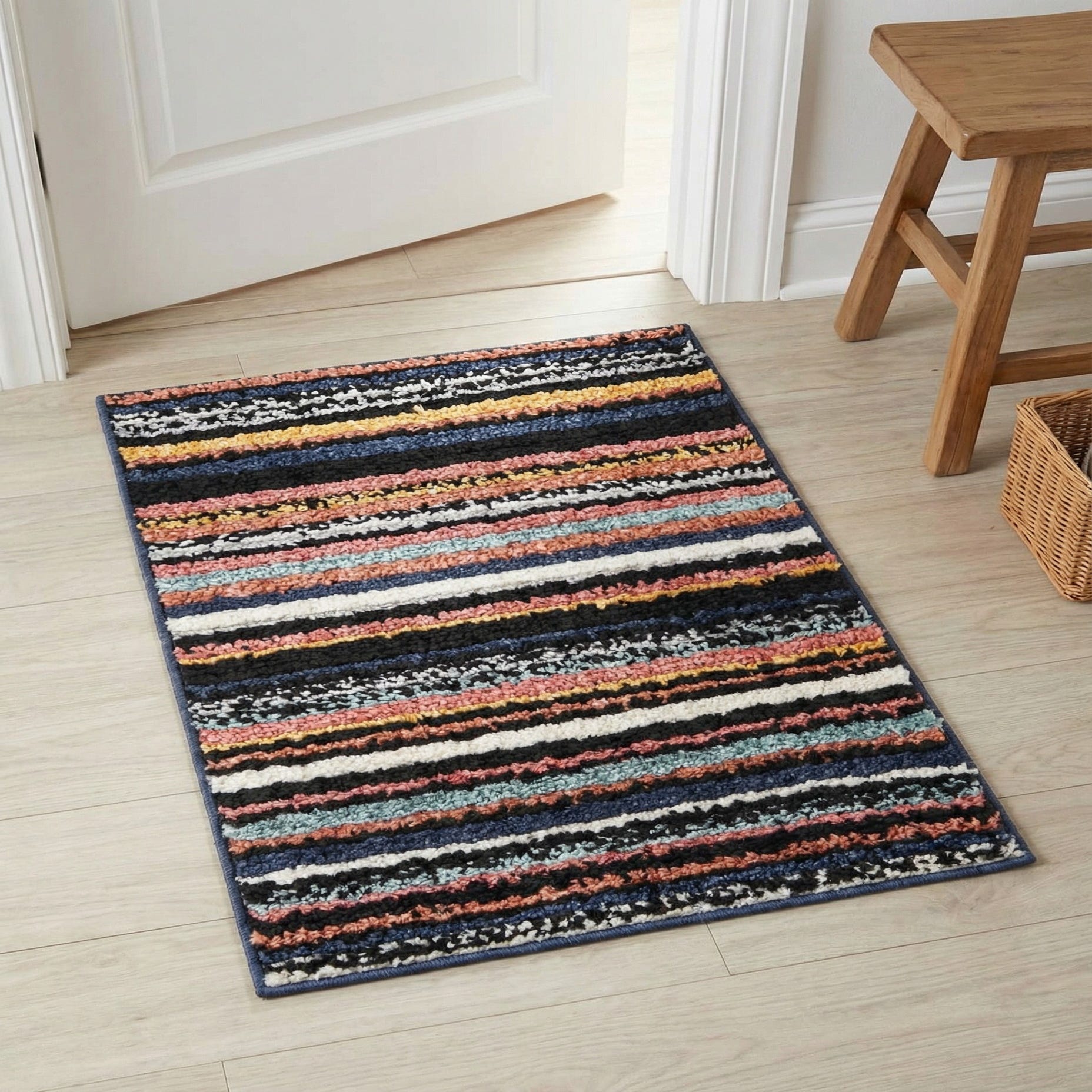 The rug's composition ensures it is stain-resistant and shed-free, maintaining a neat appearance over time. This piece's energetic design and robust hues make it an ideal choice for areas that benefit from a pop of color and visual interest, such as modern living rooms, eclectic office spaces, or even children's play areas where a touch of playfulness is desired. Its compact size also makes it suitable for entryways or as an accent piece in smaller apartments that seek to maximize stylistic impact in limited square footage.