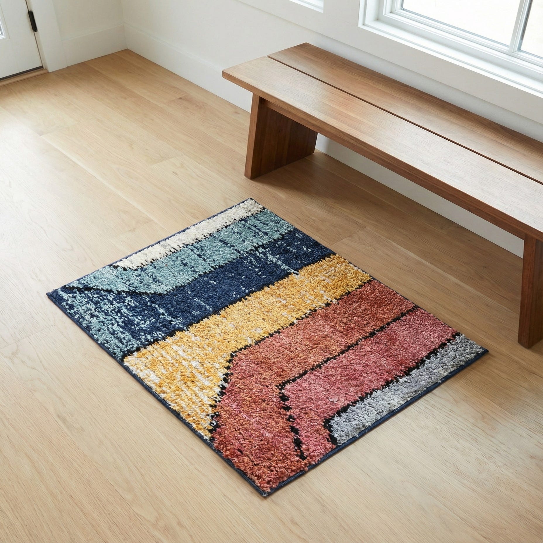 The Tagine Collection presents a vibrant 2x3 rug, machine woven from 100% polyester, offering both durability and soft texture. This rug features an eclectic array of colors, including multi, black, ivory, gray, light blue, peach, navy blue, yellow, and pink set against a multi-colored background, creating a dynamic visual impact.
