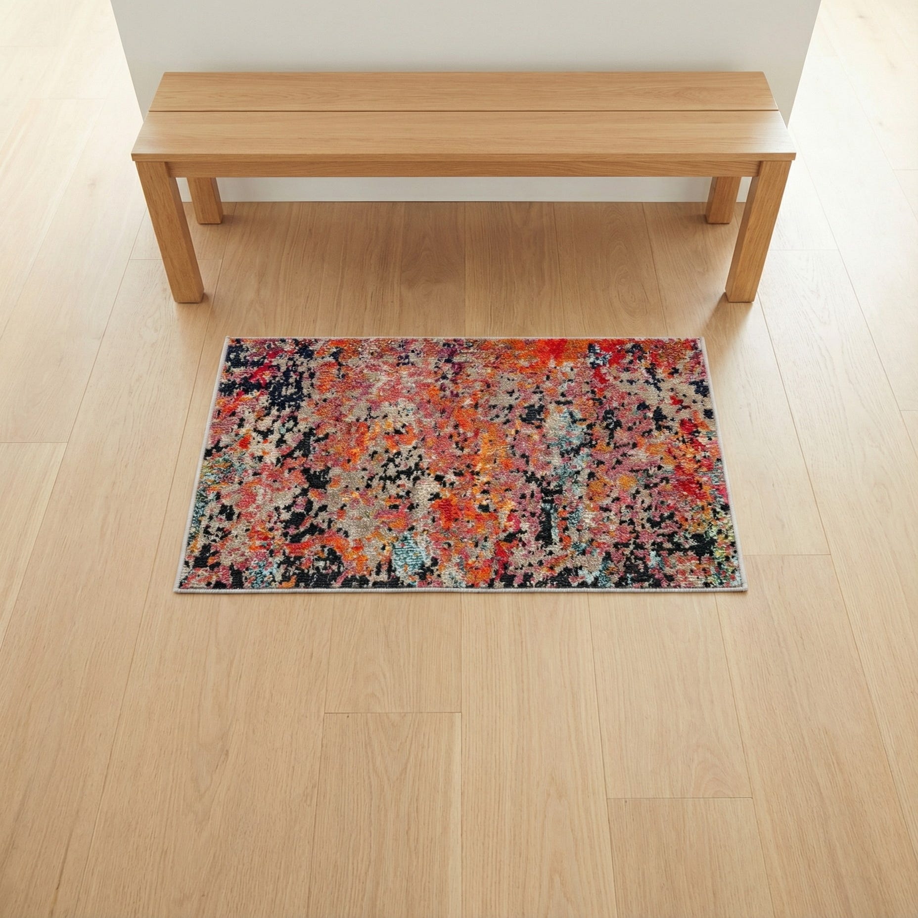 Machine-made of 100% polypropylene, the rug has a low, dense pile with a slightly textured, nubby hand that highlights the color detail underfoot. The construction delivers consistent pattern definition and a secure bound edge. Place it in small entryways or in front of a kitchen sink to introduce color, tuck it beside a bed for a lively touch at your bedside, or use it to anchor a reading nook or home office chair — it pairs well with neutral furnishings, mid-century pieces, or industrial metal accents to create a bold, lived-in layer.