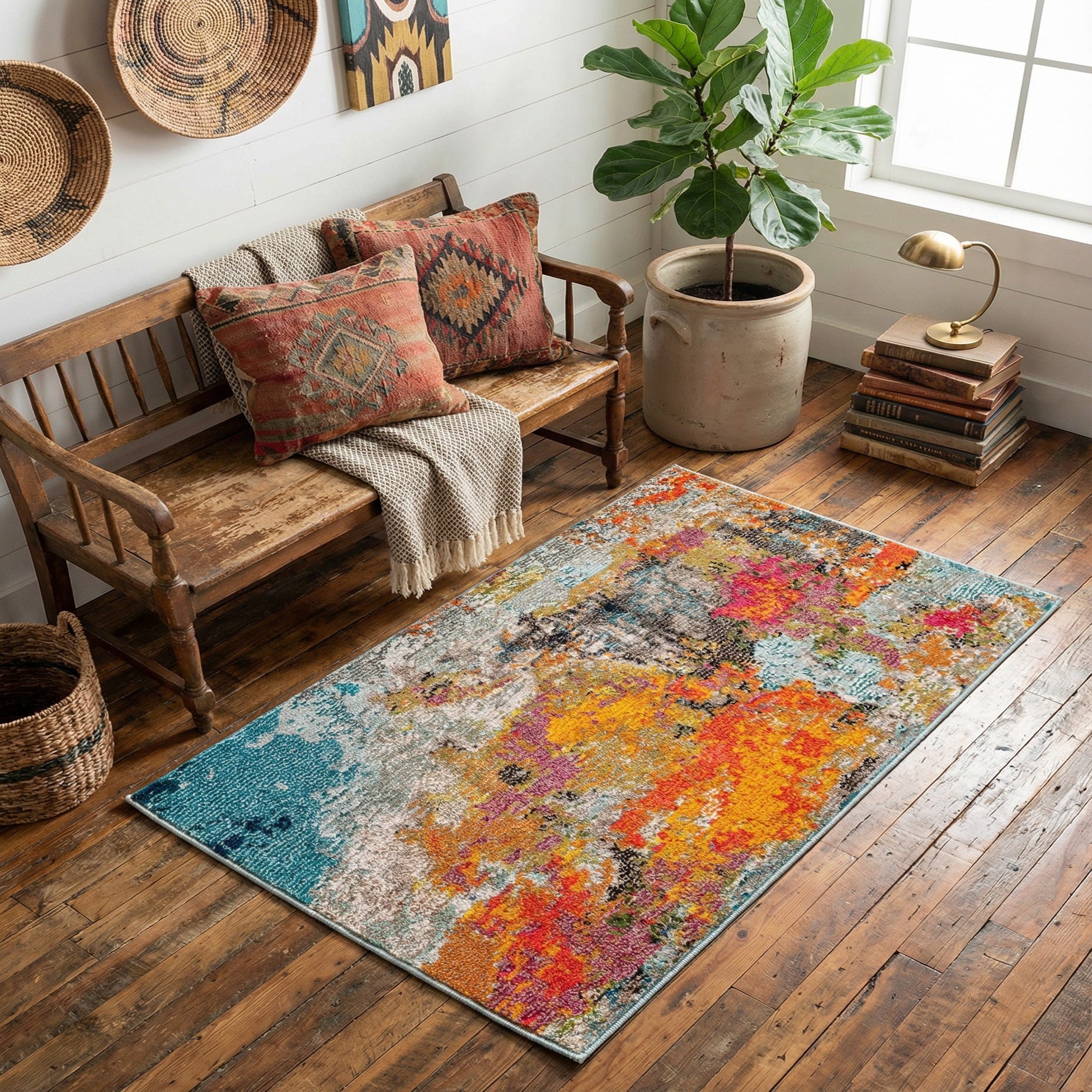 A bold, painterly abstract with a layered, distressed look, this rug brings lively color and contemporary movement to the floor. Large, irregular washes of orange, yellow, pink and purple sit against pockets of light blue and gray, all set on a multi-hued background that creates depth and visual texture. The pattern reads like an artful collage of brushstrokes and faded motifs, offering a modern, gallery-ready aesthetic.