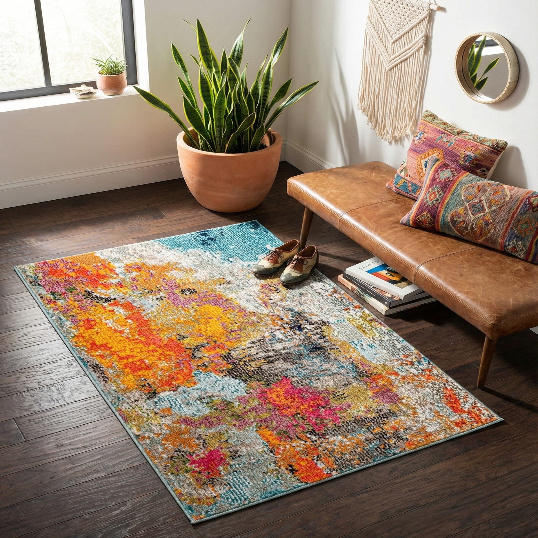Machine made from 100% polypropylene, the rug has a low-to-medium pile with a tight construction that feels soft and slightly cushioned underfoot while showing subtle variations in sheen. Use it to inject color into a small living area, brighten an entry or hallway, or place it beside a bed for a lively bedside accent. It pairs well with warm wood tones, neutral upholstery, or mid-century modern furnishings, and can also anchor a creative studio or children's play space where color and pattern are the focus.
