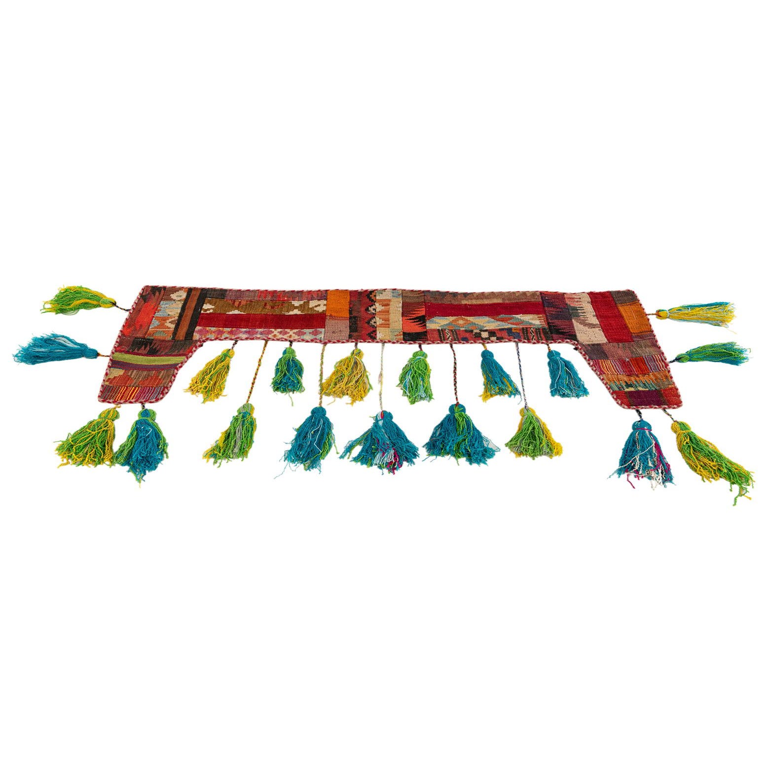 A vibrant, multi-colored rectangular wall art piece with abstract patterns and numerous green and blue tassels hanging from the bottom.