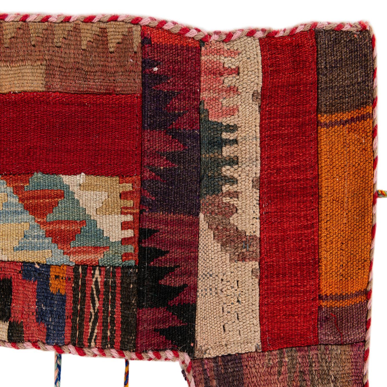 Hand woven from wool and cotton, this compact piece presents a stitched-together field of geometric motifs and linear bands in a multi-colored background. Rust red and warm browns anchor the design while beige and light brown panels add depth; pops of blue and yellow brighten the composition. The body has a firm, flat-woven hand with a tactile, slightly textured weave, and a row of long, multicolored tassels along the lower edge introduces soft movement and an artisanal finish.