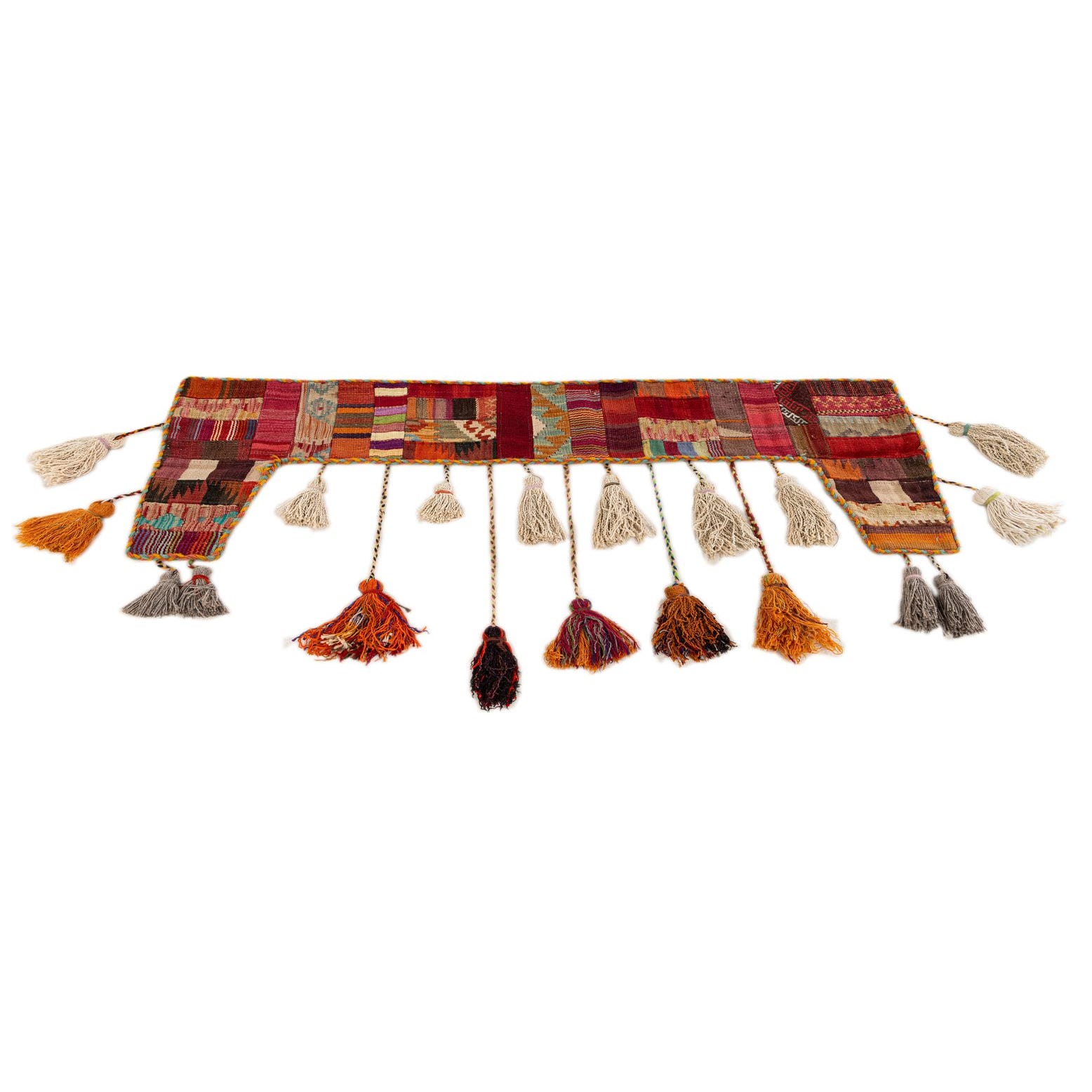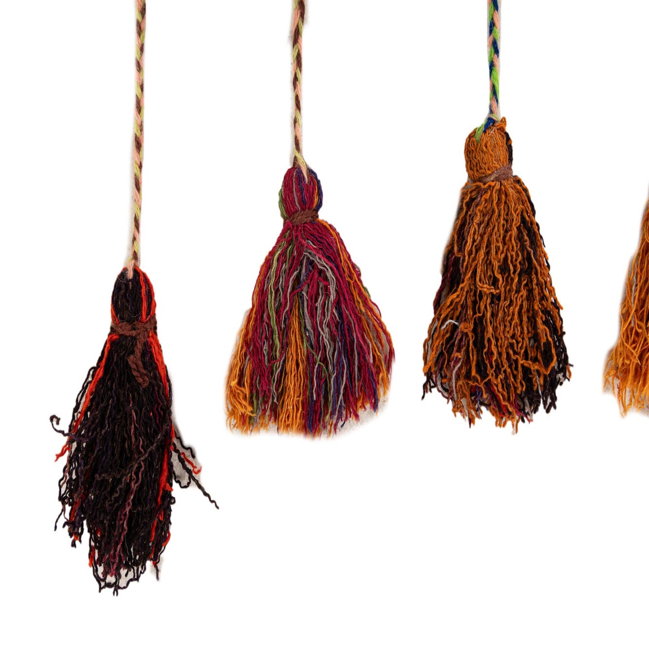 A vibrant 2x3 rectangular multi-colored abstract wool wall art piece with various tassels hanging from the bottom.