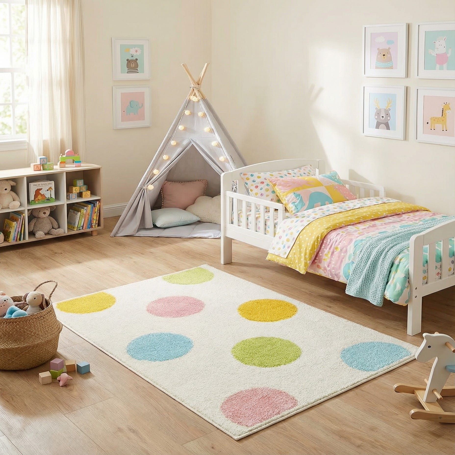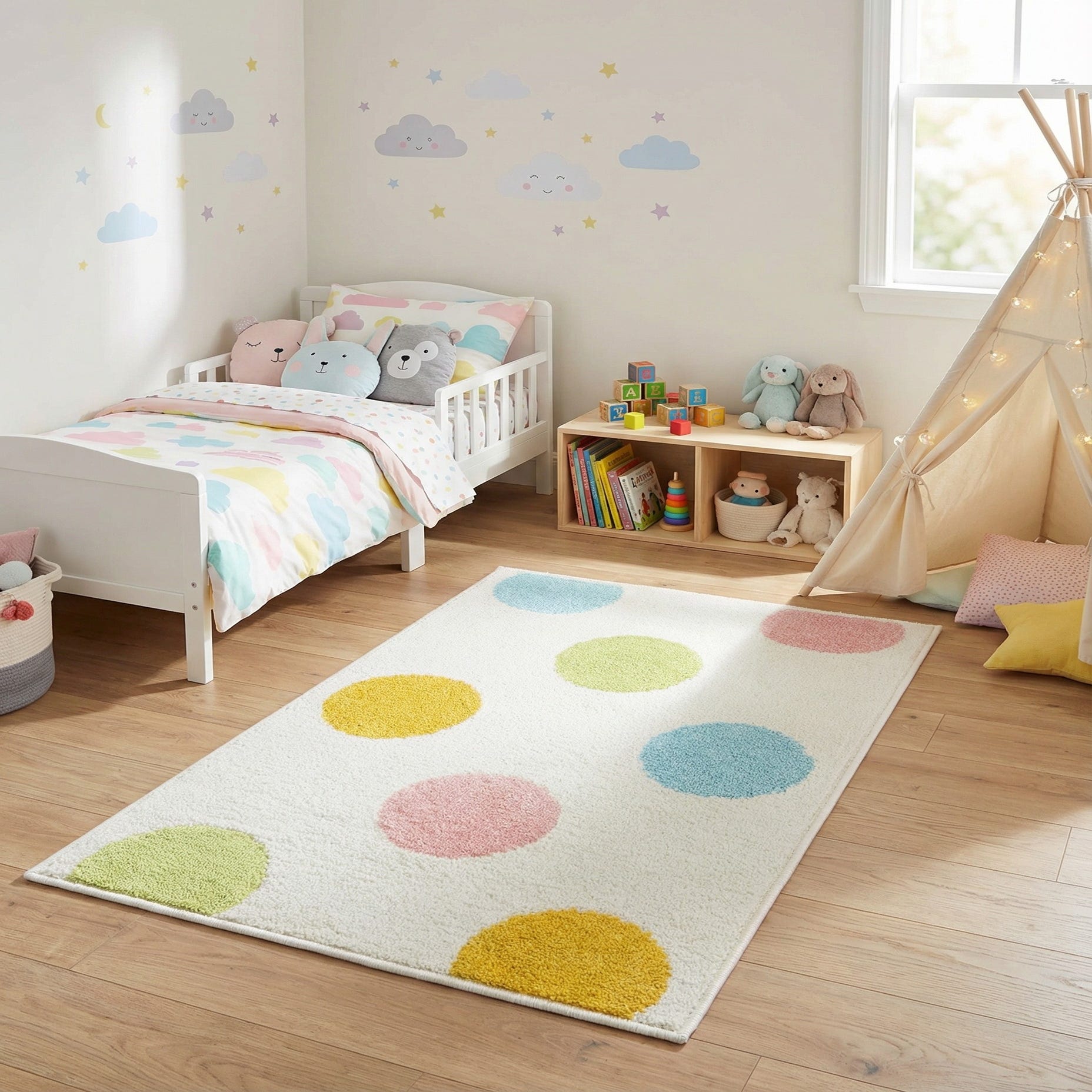 This rug is well suited to a child's bedroom or nursery, a bright playroom, or a casual reading nook where its cheerful dots can anchor toy storage and seating. It also layers nicely in contemporary or Scandinavian-inspired spaces alongside natural wood furniture and soft pastel textiles, or pairs with neutral upholstery to add a pop of color without overwhelming the room.