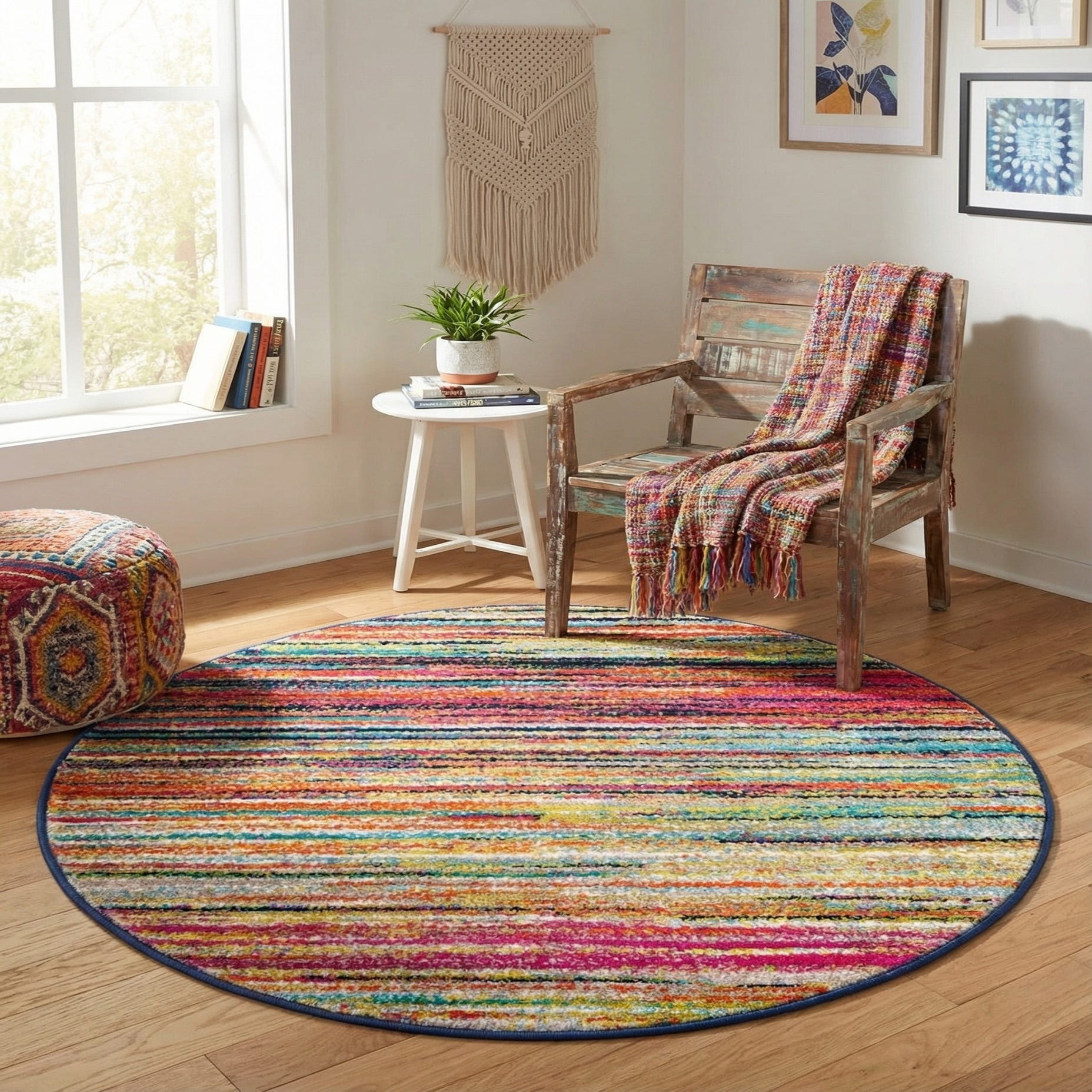 A lively banded pattern of narrow, irregular stripes gives this round rug a fresh, contemporary look with a playful, handwoven feel. The multi background is threaded with blue, navy blue, green, light green, ivory, brown, orange, pink, purple and bright accent tones that create a layered, painterly effect. The navy serged edge neatly frames the colorwork and reinforces the rug’s clean silhouette, making the stripes read clearly from any angle.