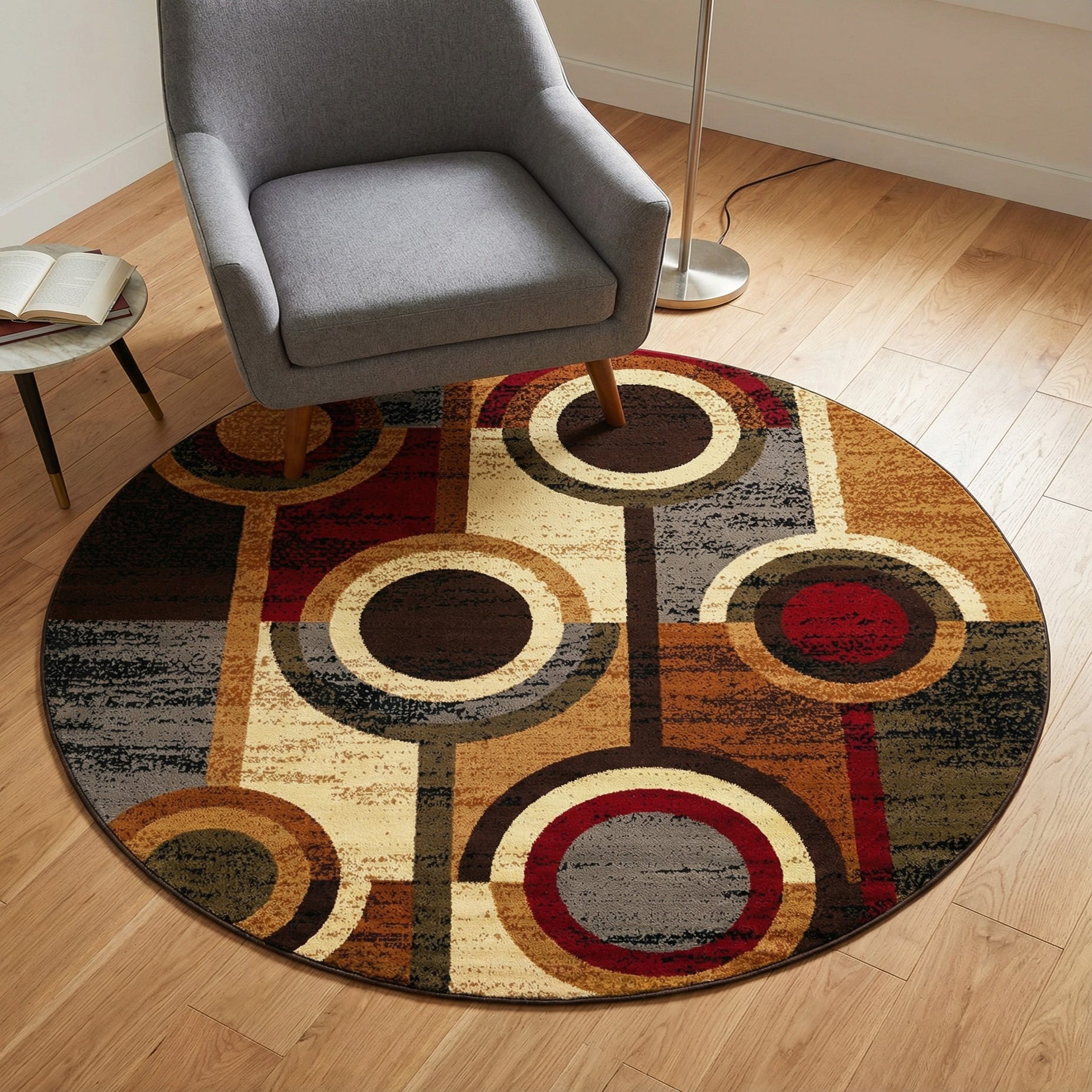 A bold geometric layout of concentric rings and rectangular blocks gives this round rug a modern-retro character. The multi background supports a palette of beige, black, brown, gray, maroon, olive, red and light brown arranged in overlapping circles and vertical bars, with a subtle distressed texture that adds visual depth. The pattern reads energetic without being busy, and the short, low-pile surface has a smooth, slightly cushioned hand that’s comfortable underfoot.