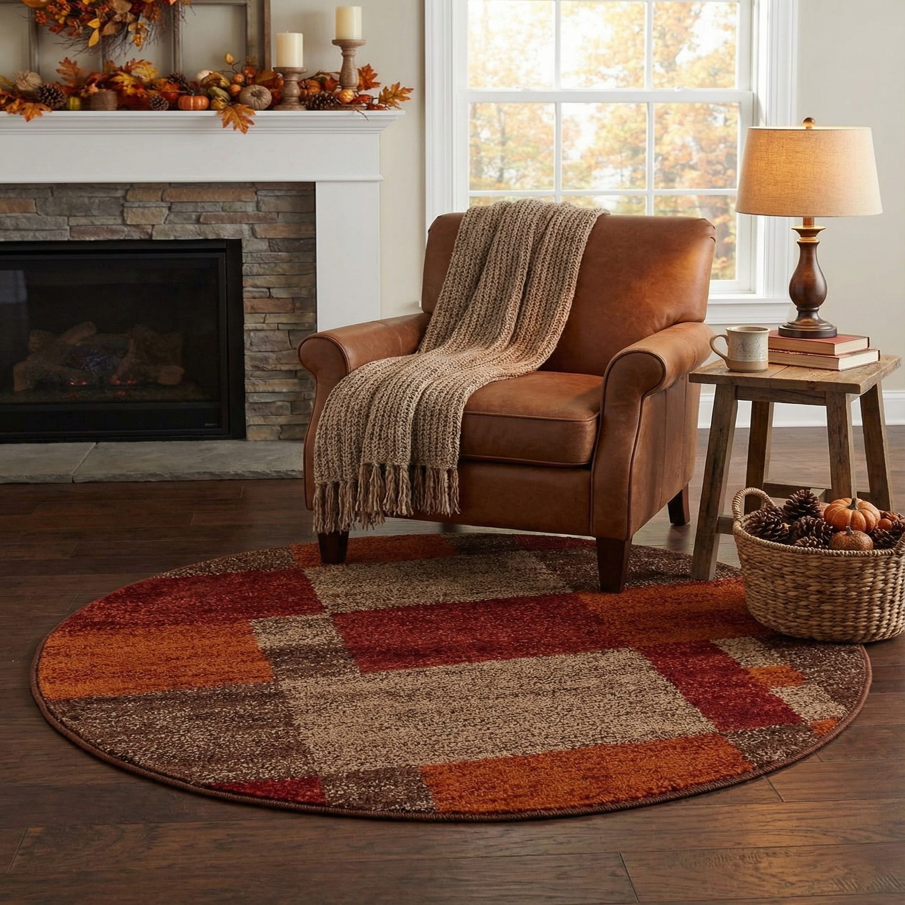 A round accent rug with a modern block pattern of overlapping squares and rectangles in a warm autumnal palette. Burgundy and orange blocks sit alongside brown and beige fields against a multi background, creating a layered, geometric look. Machine made of 100% polypropylene, the surface has a dense, softly textured pile that feels warm underfoot and adds visual depth without heavy ornamentation.