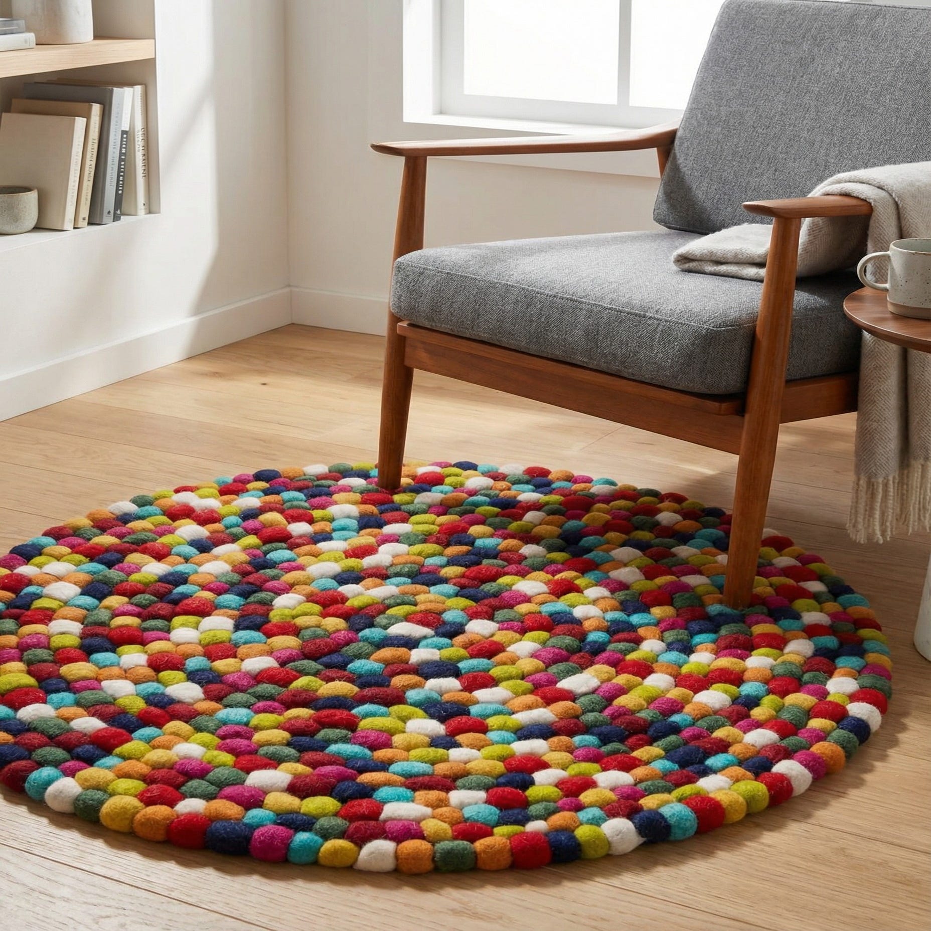 This round piece works well as a cheerful anchor in a small seating area, a bedside accent, or a cozy reading nook. It pairs naturally with bohemian and eclectic interiors, and can add a lively counterpoint to mid-century modern or Scandinavian schemes that favor clean lines and neutral furnishings. It’s also a practical, colorful choice for playrooms or nurseries where a tactile surface adds visual interest and warmth.