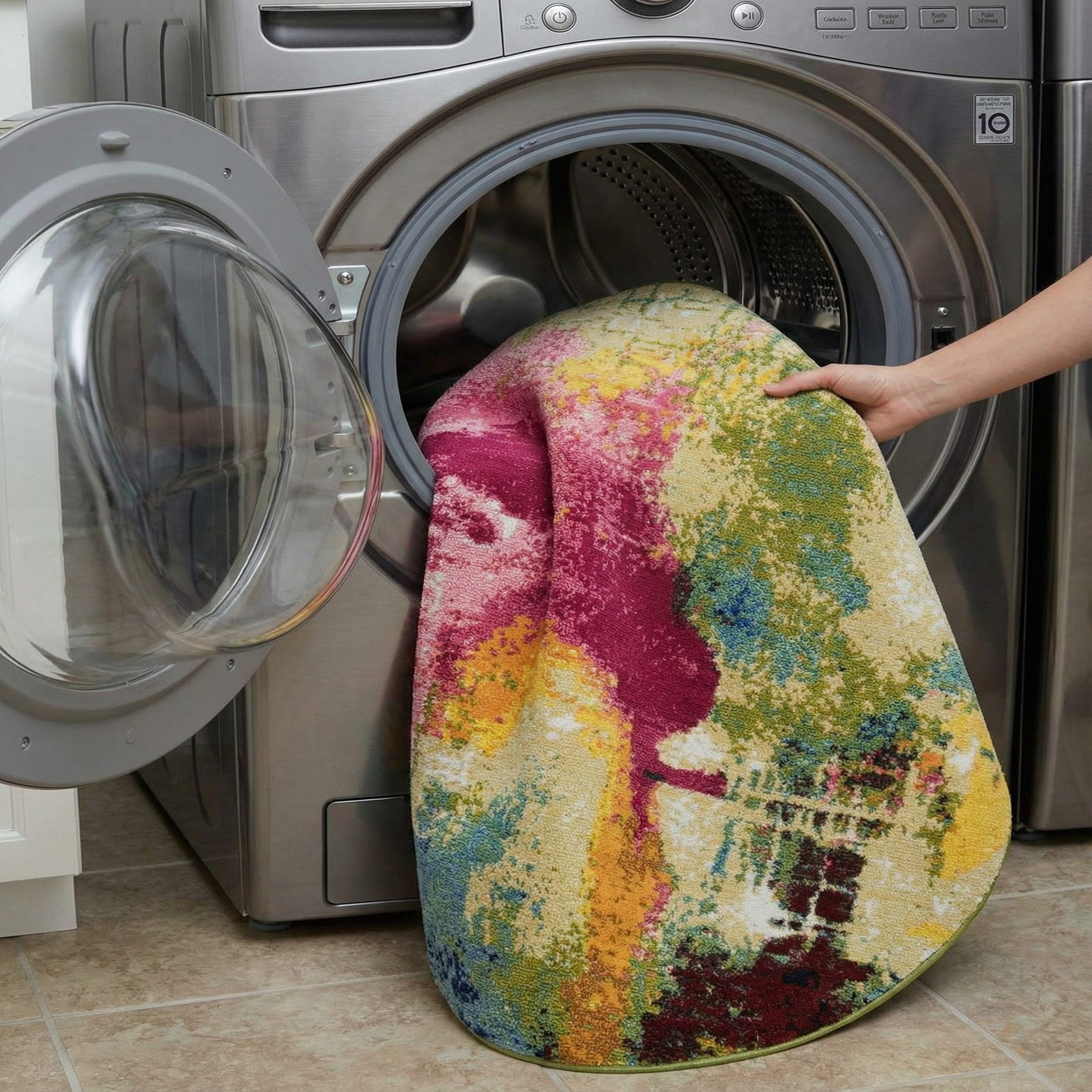 Machine-made from 100% polypropylene, the pile is low and dense, offering a soft but sturdy feel underfoot with a slight sheen that enhances the saturated hues. Place this rug beneath a small dining set or round bistro table, anchor a cozy reading nook, or use it to add a burst of color to a neutral living room or bedroom. It pairs well with warm wood finishes, mid-century modern silhouettes, and eclectic or bohemian interiors that welcome layered textures and bold color.