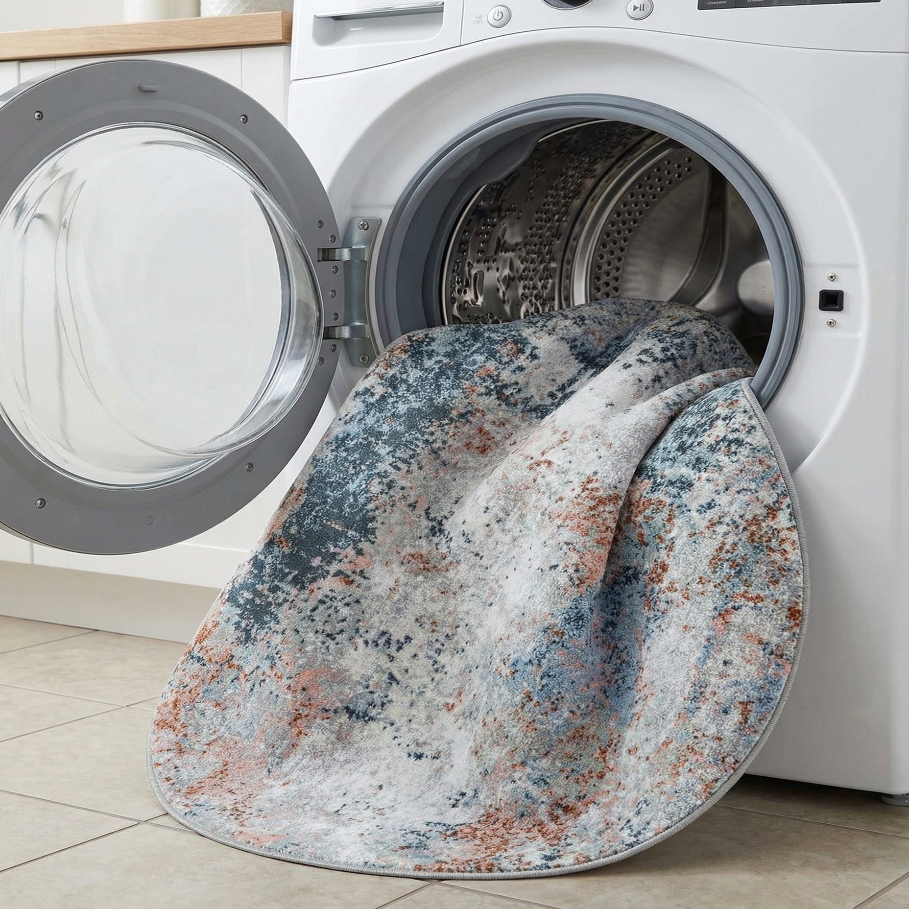 An abstract, painterly pattern brings movement and layered color to this round rug. Pools of navy and light blue mingle with soft gray and touches of rust red and pink across a multi-colored background, creating a gently distressed, contemporary look. The machine-made construction yields a low, dense pile that feels soft and slightly plush underfoot, with a smooth surface that highlights the subtle color variations and mottled shading.