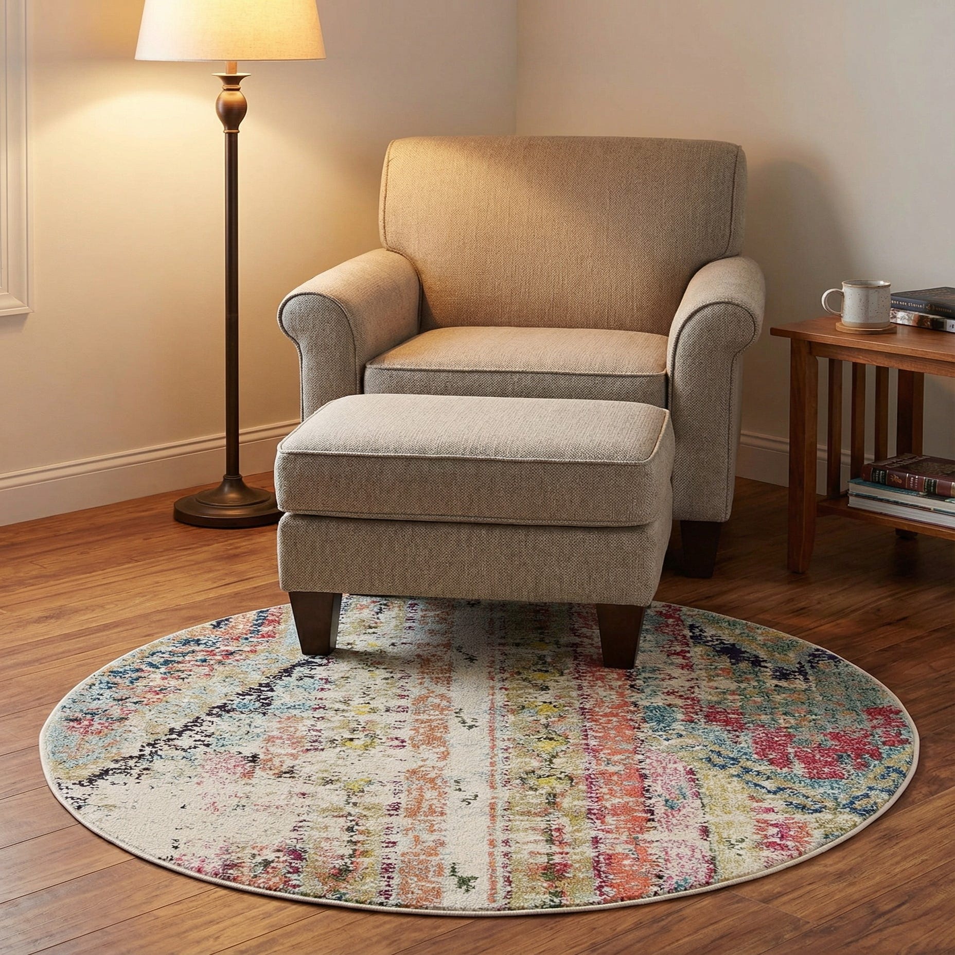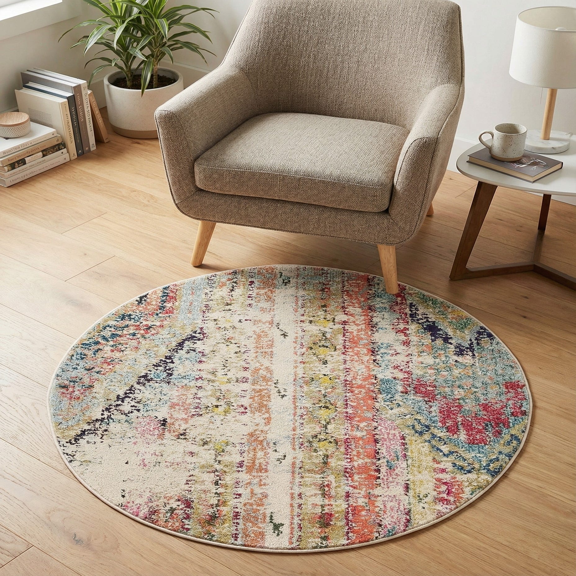 The round shape works well under a small dining or bistro table, layered beneath a round coffee table, or placed in a reading nook or entryway to introduce color and pattern without overwhelming the space. Its eclectic palette pairs nicely with neutral sofas and textured linens, warm wood tones and rattan, or midcentury silhouettes, and it complements bohemian, coastal, and transitional interiors where a lively, artful rug can anchor the room.
