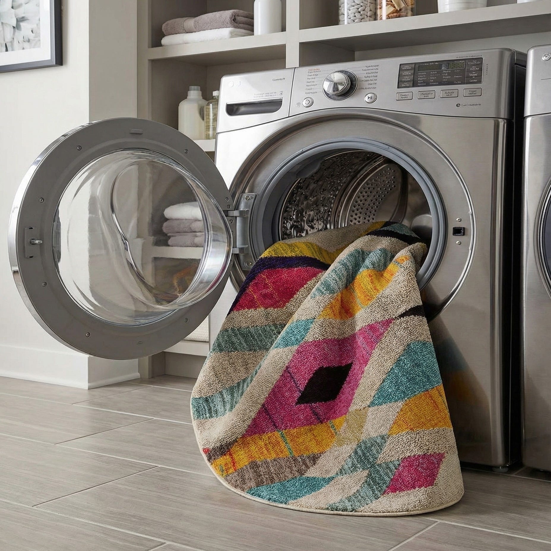 The round shape and multi-hued palette make this piece versatile: use it to anchor a small seating area, place it beneath a round café table in a breakfast nook, or brighten an entryway or playroom. It pairs well with mid-century and modern bohemian furnishings, natural wood tones, and neutral upholstery when you want a controlled burst of color without overwhelming the room.