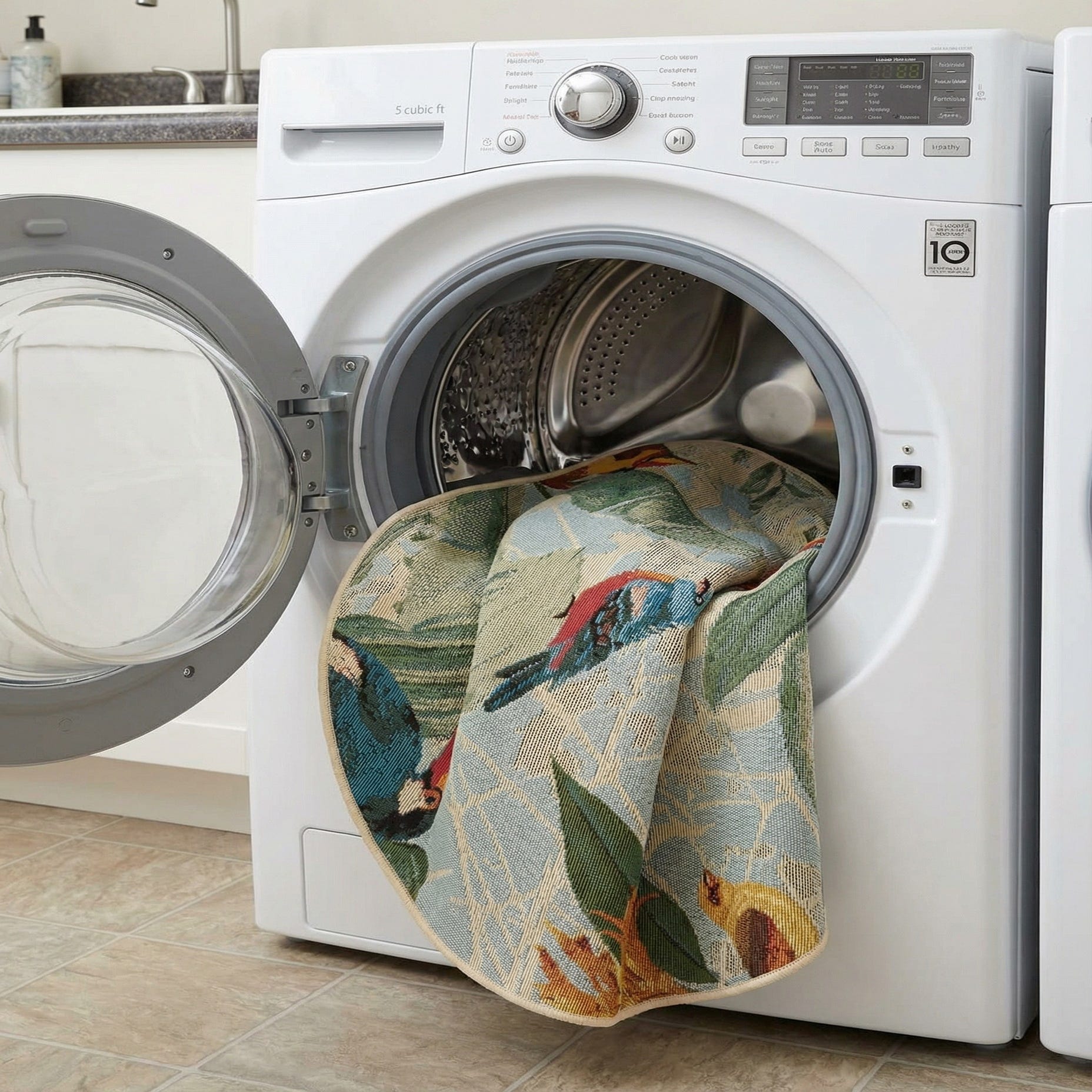A round, multi-colored botanical rug featuring vibrant parrots, toucans, and other birds amidst green and blue tropical leaves, perfect for a patio.
