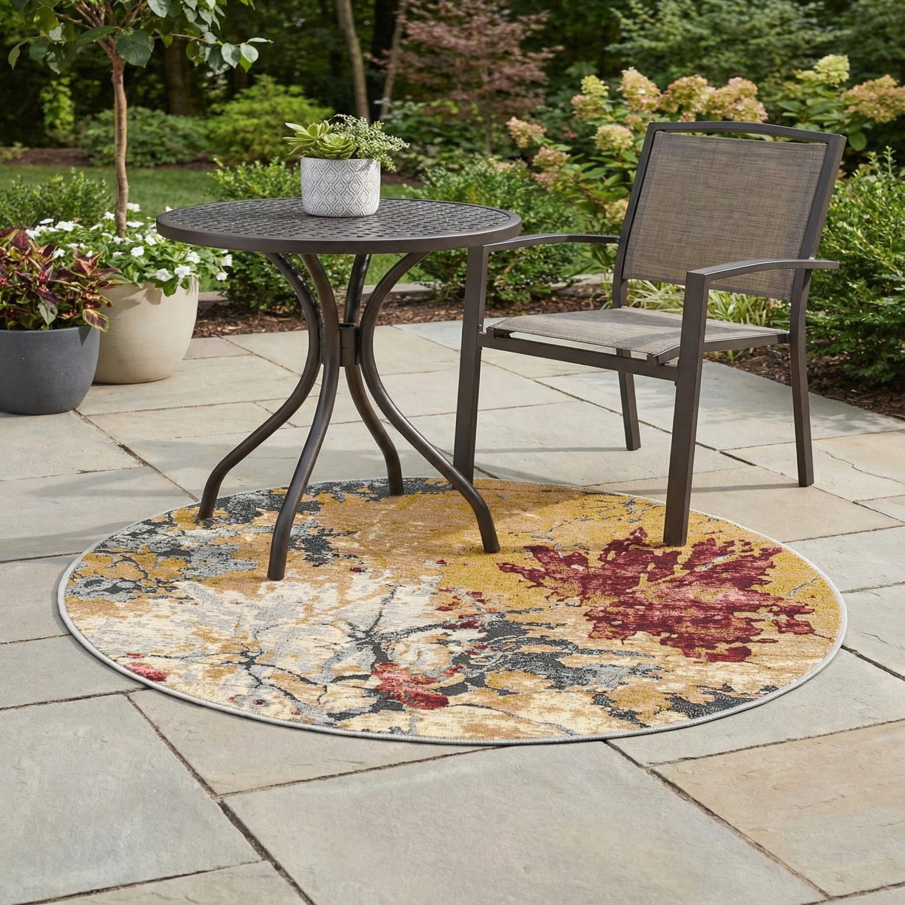 The Outdoor Modern collection presents a sophisticated 3 Ft Round rug that boasts durability and versatile style, machine-woven from 100% polypropylene. This rug features a mixed palette of Multi, Beige, Gold, Gray, Ivory, and Burgundy hues, set against a dynamic Multi-colored background. The pattern is an abstract blend that evokes the look of weathered elegance with a contemporary edge, making it adaptable to both modern and traditional settings.