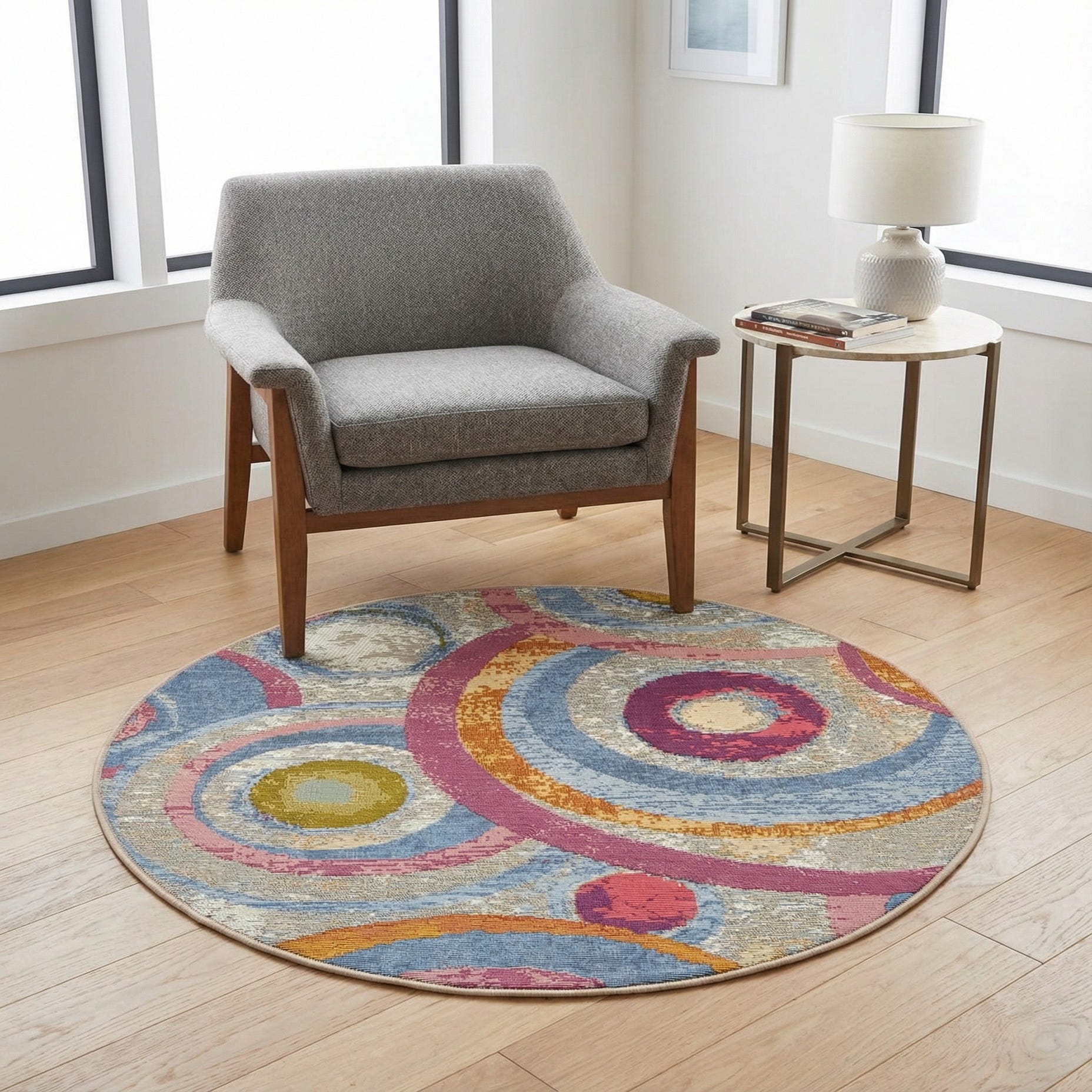 A lively, modern abstract of overlapping concentric circles and sweeping arcs gives this round rug bold motion and layered depth. The multi background provides a textured canvas for bands of blue and navy, warm gold and beige, olive and yellow, and bright accents of pink and gray. The pattern has a painterly, slightly distressed effect with irregular edges and stacked color fields that create visual interest from every angle.