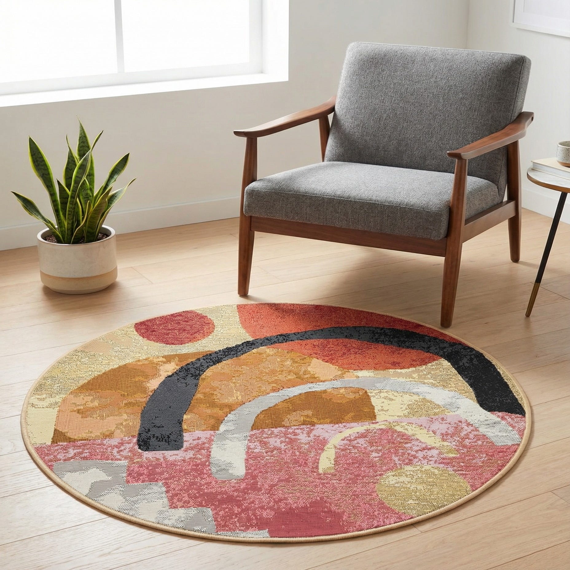 An abstract study in shape and warm color, this round rug pairs bold arches and soft circles with layered planes of pink, red, orange, gold, ivory, light brown and black against a multi-tonal background. Broad black and ivory arcs cross textured fields of dusty pink and warm ochre, while smaller yellow and gold accents add a lively, sunlit punch. The pattern feels modern and artistic, with an organic, hand-drawn quality to the shapes and a composed balance between movement and calm.