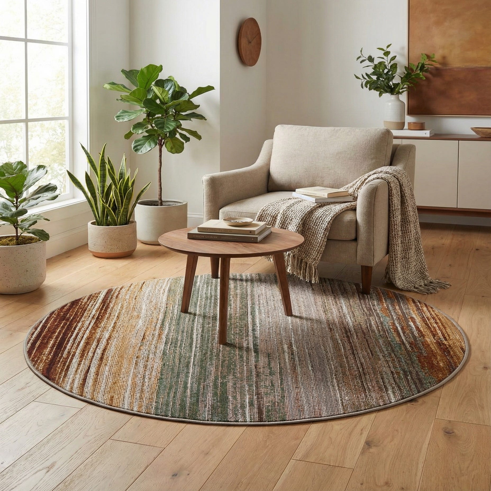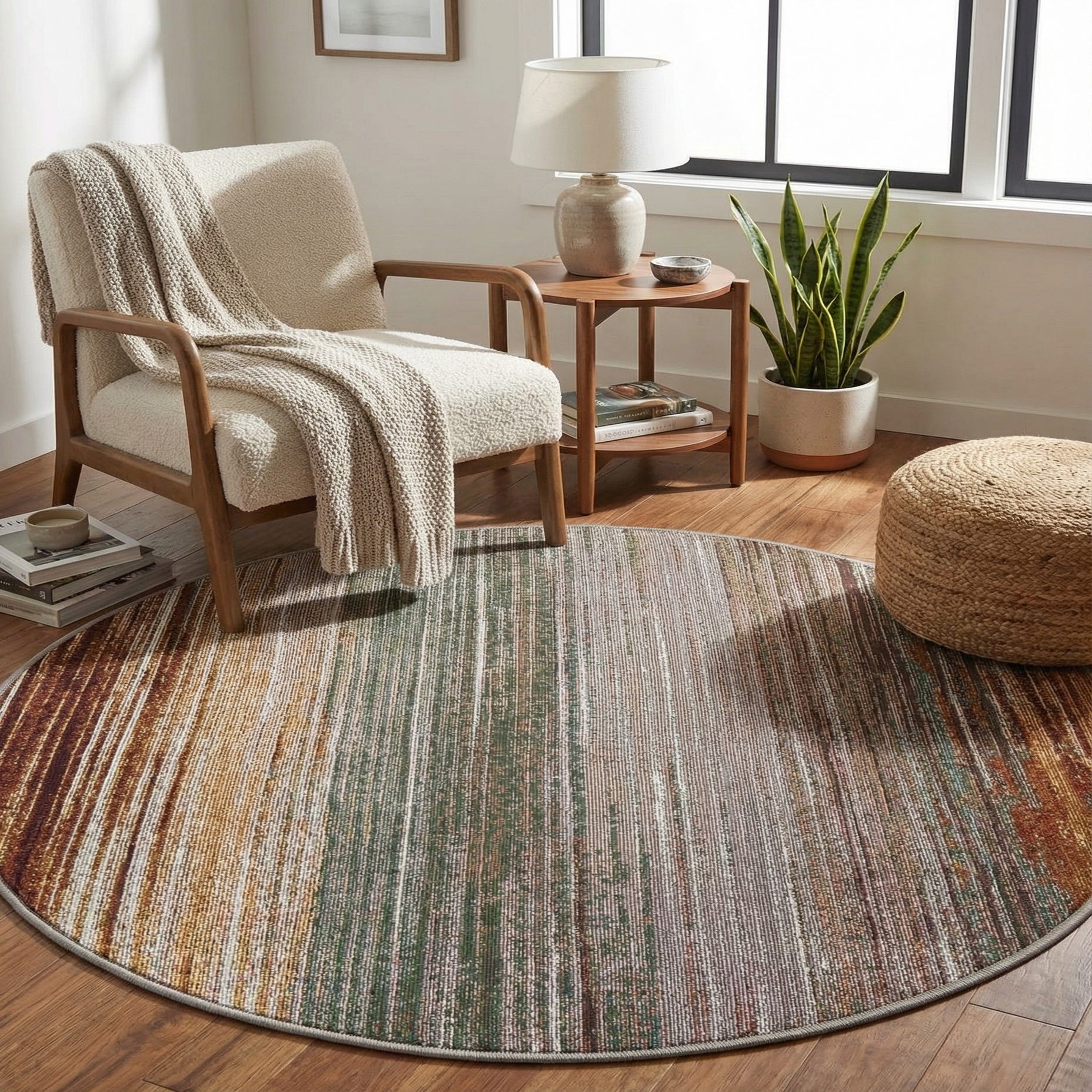 A round rug with a linear, striated pattern of narrow horizontal bands that flow across the surface. The background is multi, layered with bands of beige, brown, gray, ivory, terracotta, yellow, green and burgundy that shift from warm to cool tones. Machine made of 100% polypropylene, the weave sits low and tight with a slightly ribbed hand; running your fingers across it reveals a firm, flat texture that holds its shape and shows the color variation clearly.