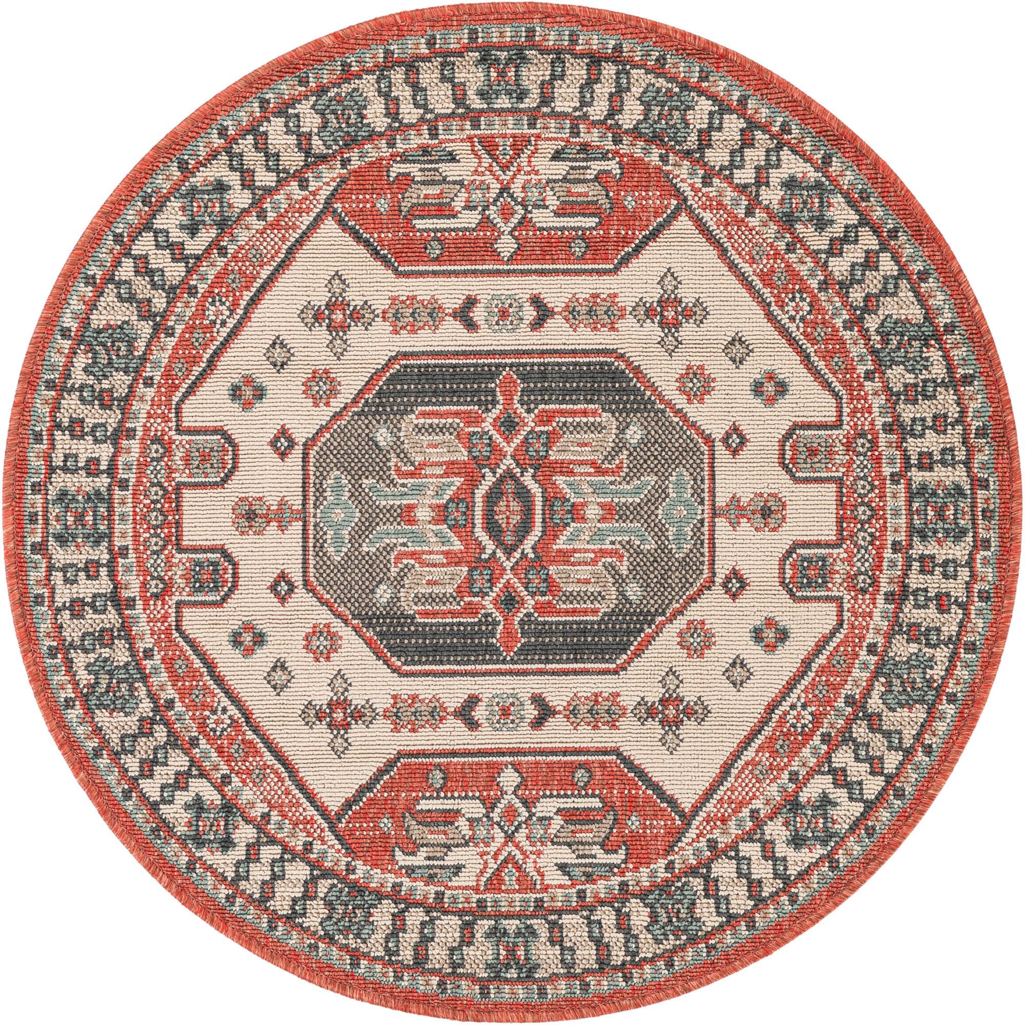 A classic medallion layout gives this round rug a traditional, structured look: an octagonal central motif anchors the design, surrounded by an ivory field punctuated with small floral and geometric accents and framed by multiple concentric borders. The palette is warm and versatile — a multi background with bold red, deep black and ivory highlights — that brings contrast and definition to the pattern without overwhelming a space. Machine made from 100% polypropylene, the surface is low-profile and tightly woven, with a slightly ribbed hand that feels firm underfoot and holds the pattern’s crisp detail.