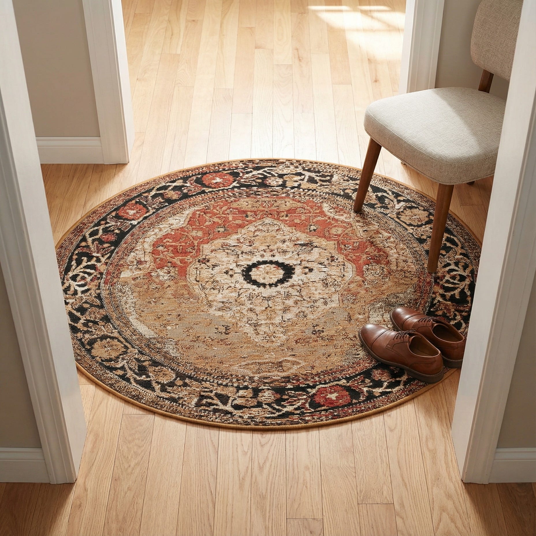A classic round medallion anchors an intricate traditional pattern, with layered floral motifs and scrolling vines that create a focused, antique-inspired look. The background is multi, woven with warm beige, brown and gold tones, while rust red highlights add warmth and black and gray accents bring contrast and definition around the border. The outer band of stylized florals in black and rust frames the central design, giving the piece a balanced, composed presence.