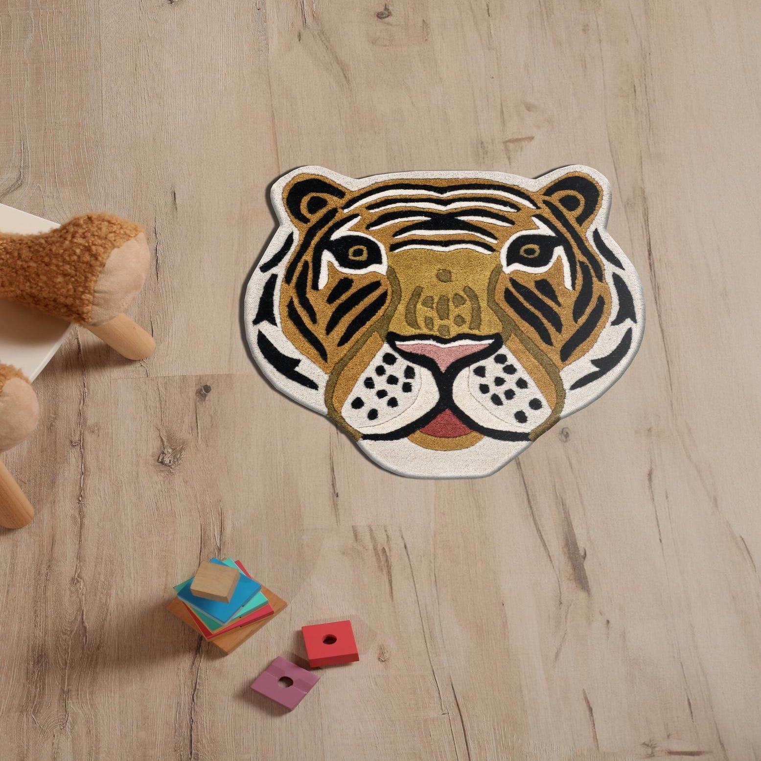 A playful tiger face rendered in bold, graphic lines gives this round hand-tufted rug a modern, kid-friendly look. The multi background sets off black and ivory stripes, light brown and olive contours, and pops of red that define the nose and mouth. Made from 80% wool and 20% cotton, the pile feels soft and springy underfoot while the tufted outlines add subtle, tactile definition to the stripes and spots.