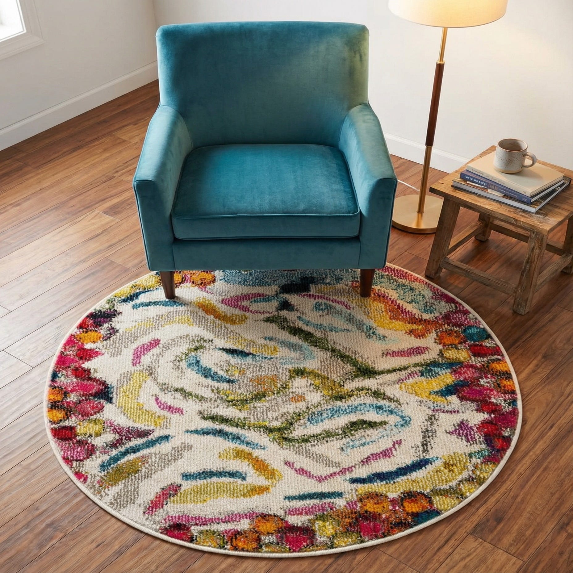 An abstract, painterly design makes this round rug feel lively without feeling busy. Swirling brushstrokes and clustered accents sit on a multi background, with layered tones of beige, gray, turquoise, blue, green, yellow, pink, red, brown and black playing across the surface. Machine-made from 100% polypropylene, the low-profile pile has a soft, slightly plush hand that gives the color fields subtle depth and a comfortable underfoot texture.